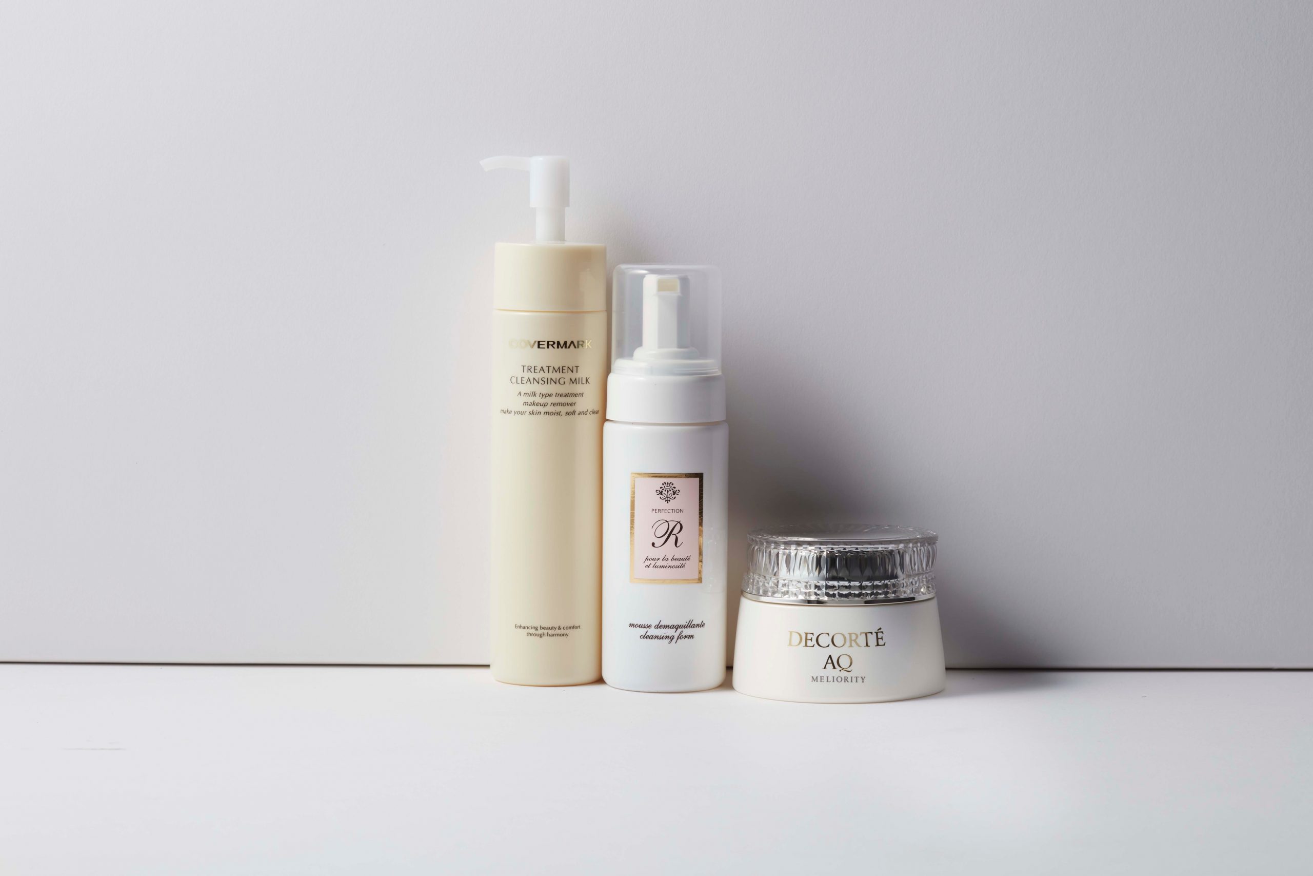 右から、スキンケア成分が贅沢に配合されたクレンジングクリーム。AQ ミリオリティ リペア クレンジングクリーム n 150g ¥10,000(コスメデコルテ) 石井美保さんが開発した泡クレンジング。ふんわり泡で肌に負担をかけずにメイクオフ。パーフェクショネール クレンジングフォーム 150mL ¥4,280(Riche) あと残り感のないすっきりとしたクレンジング力と保湿力を備えた名品。トリートメント クレンジング ミルク 200g ¥3,000(カバーマーク/カバーマーク カスタマーセンター)