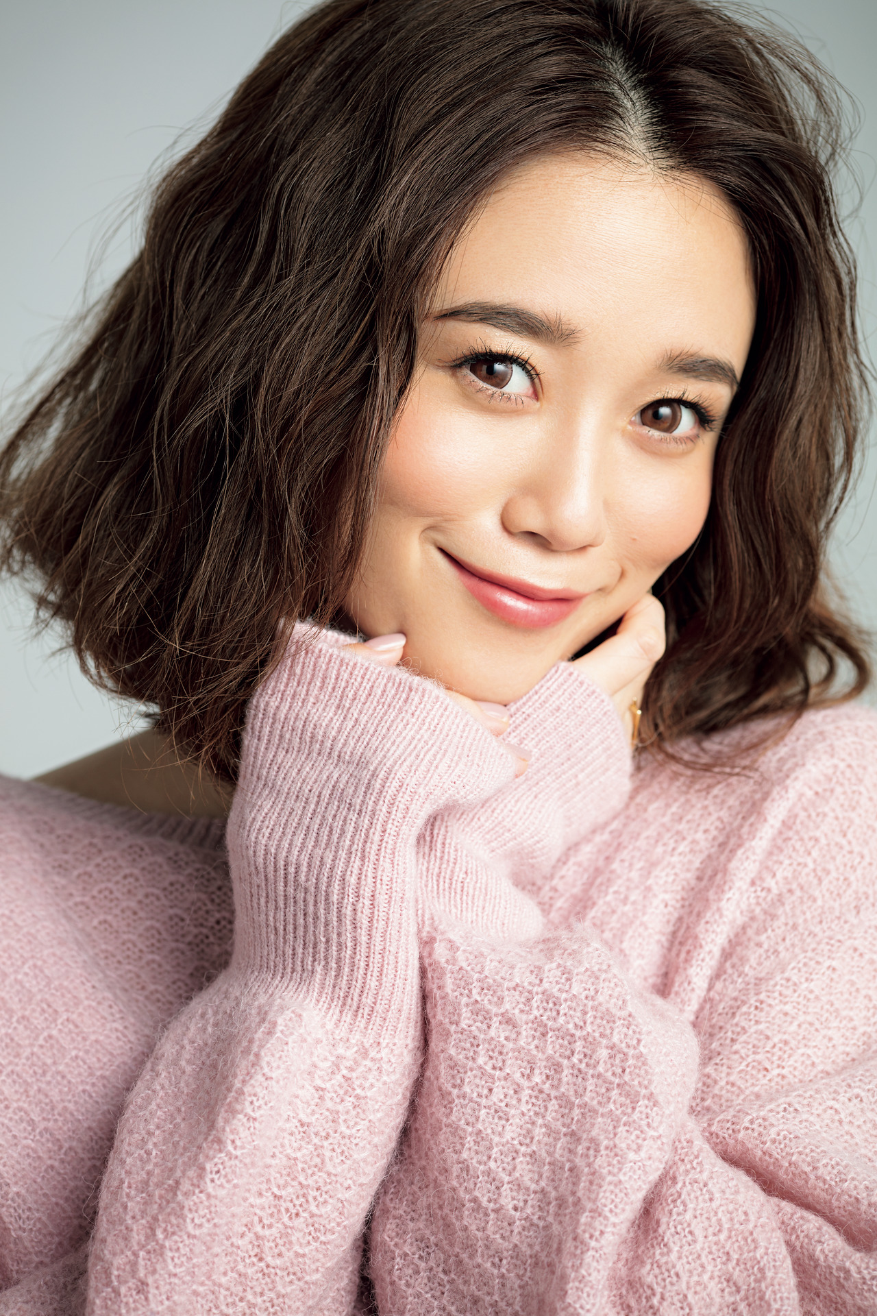 目元はカラコンの色と なじむブラウン系で、 頬と唇は控えめピンクに