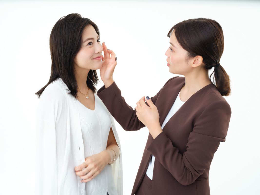 和田さん。「ほうれい線はコンシーラーでしっかりカバーすると逆に目立ってしまうことも。ハイライターを使って顔全体が明るく上がって見えるベースづくりを意識すれば目立たなくなりますよ」