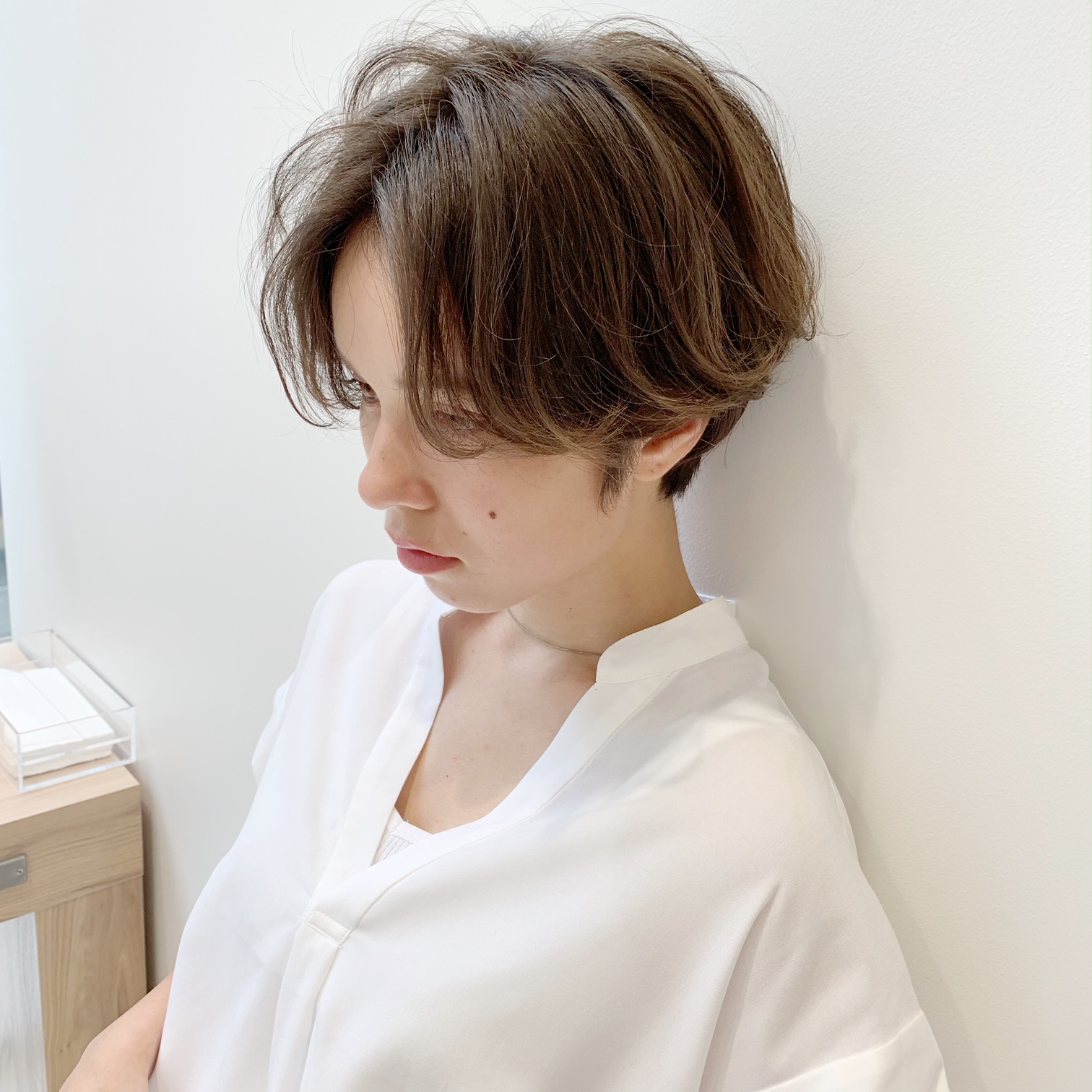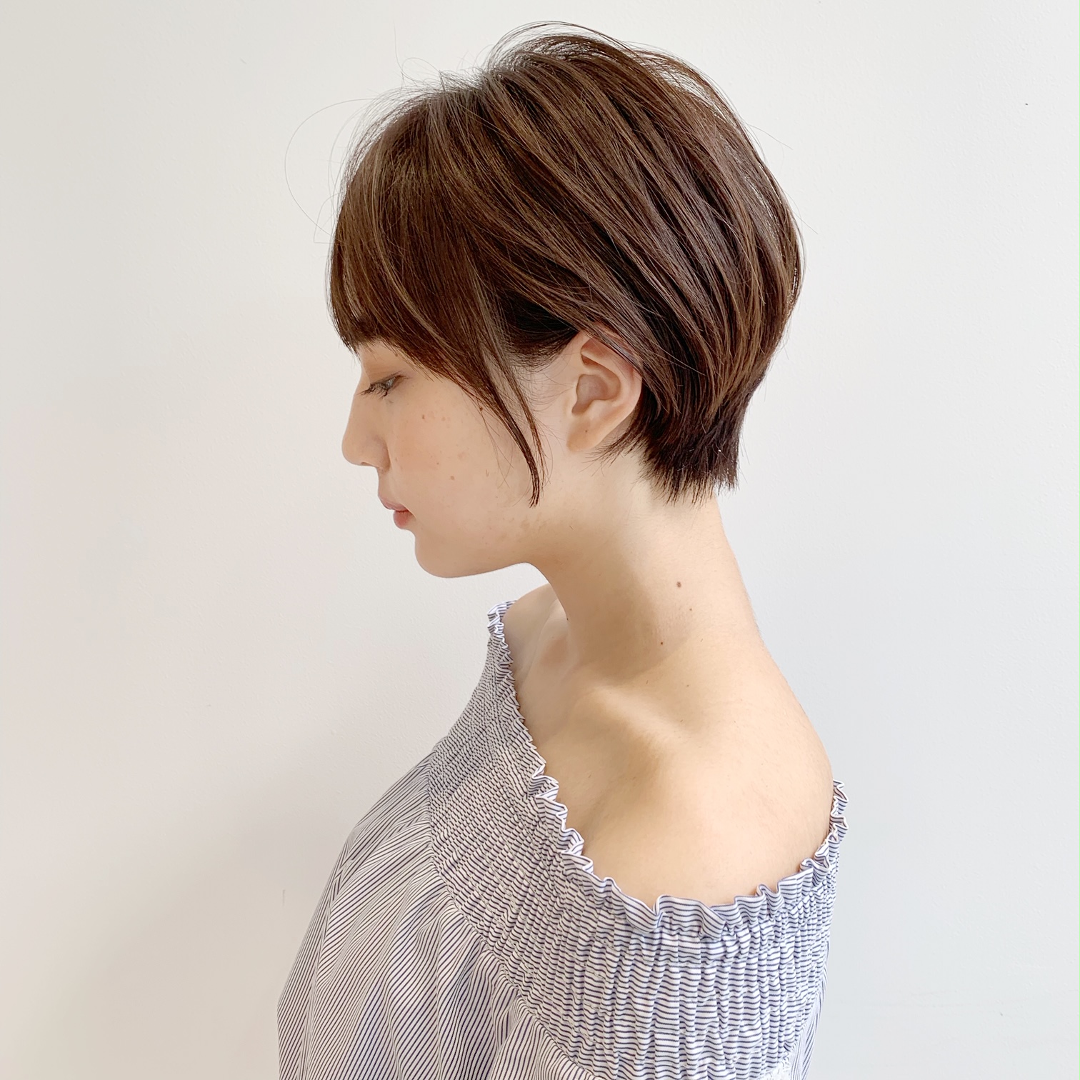 「日本人にとても多い、ハチが張っている骨格。とにかくショートカットは、ひし形のシルエットに近づけることが似合わせへの近道なので、四角いシルエットになりがちなハチ張りさんは、トップが高く見えるようにカットするのが正解。硬い髪質ならレイヤーの入れ方に、くせ毛ならスタイリングの方法が、柔らかい髪質なら短めのレングスにすることが大事になってきます」