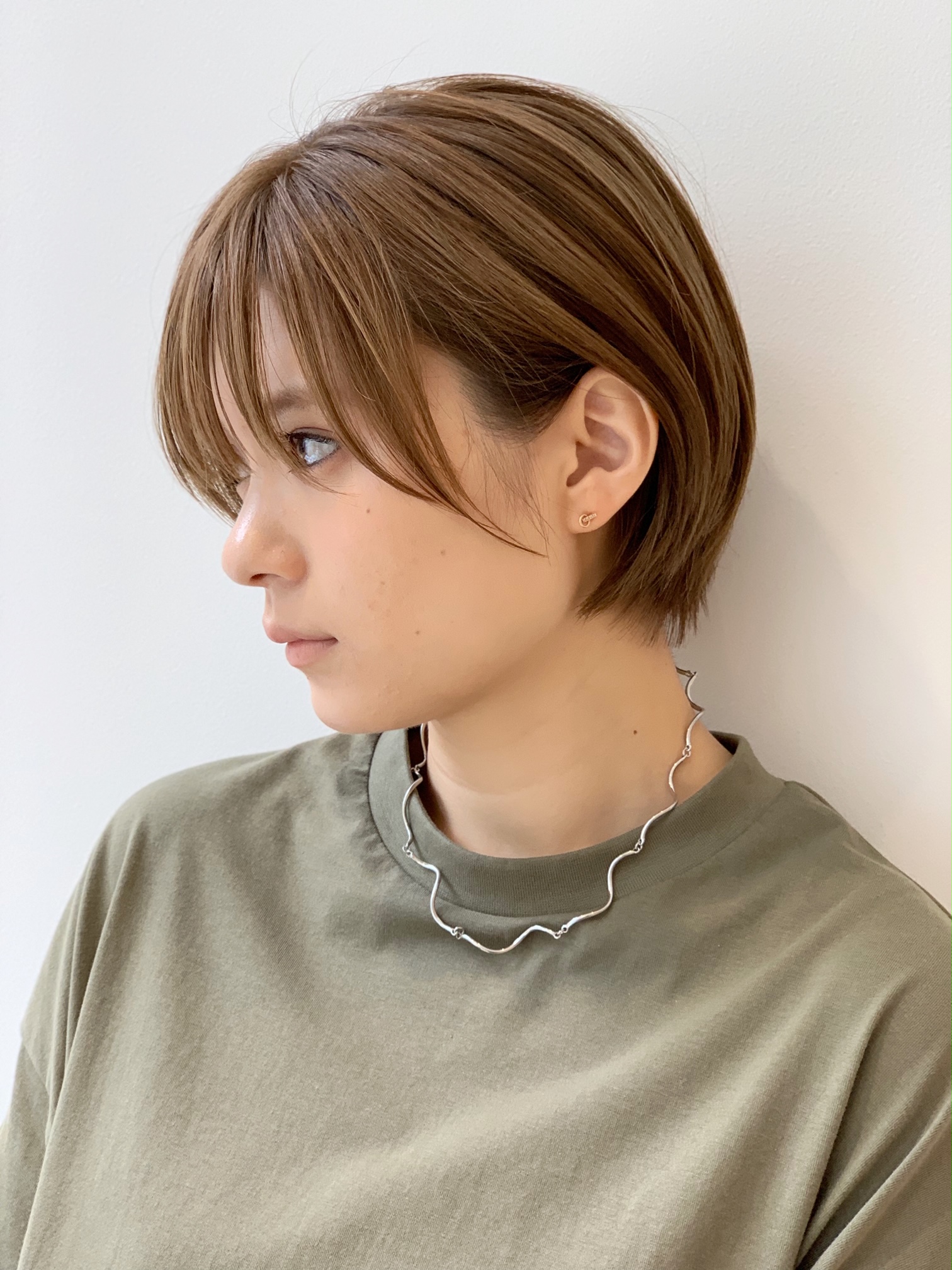 「髪の重さでトップが潰れてしまわないように、全体的に短めにカットし、耳にかけてスタイリングします。サイドの髪を耳にかけることで、シルエットがすっきりしてメリハリが生まれ、小顔効果も。ハチ部分は重めに、それ以外を軽めにして、動きとふんわり感を出します。襟足も短めに、ペタンとしてしまうのを避けるために、前髪は作ることをおすすめします」