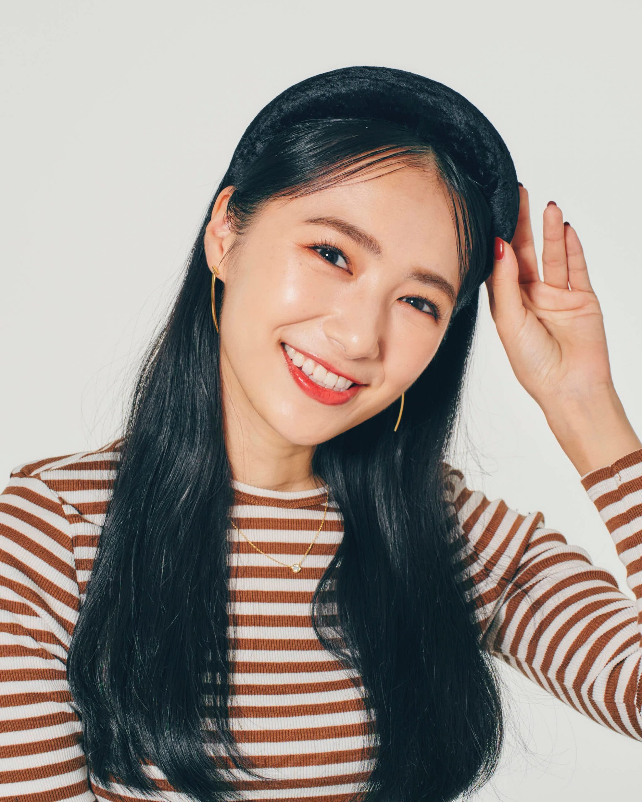 アラサー女子がつけるカチューシャは「太め」が正解。重厚感のあるベロア素材が、リッチな印象に仕上げてくれます。あえて髪色となじませて統一感を出すのがポイント。つけるだけでグッと華やかに見えるので、シンプルコーデの日、ダウンスタイルの時にもおすすめです。
