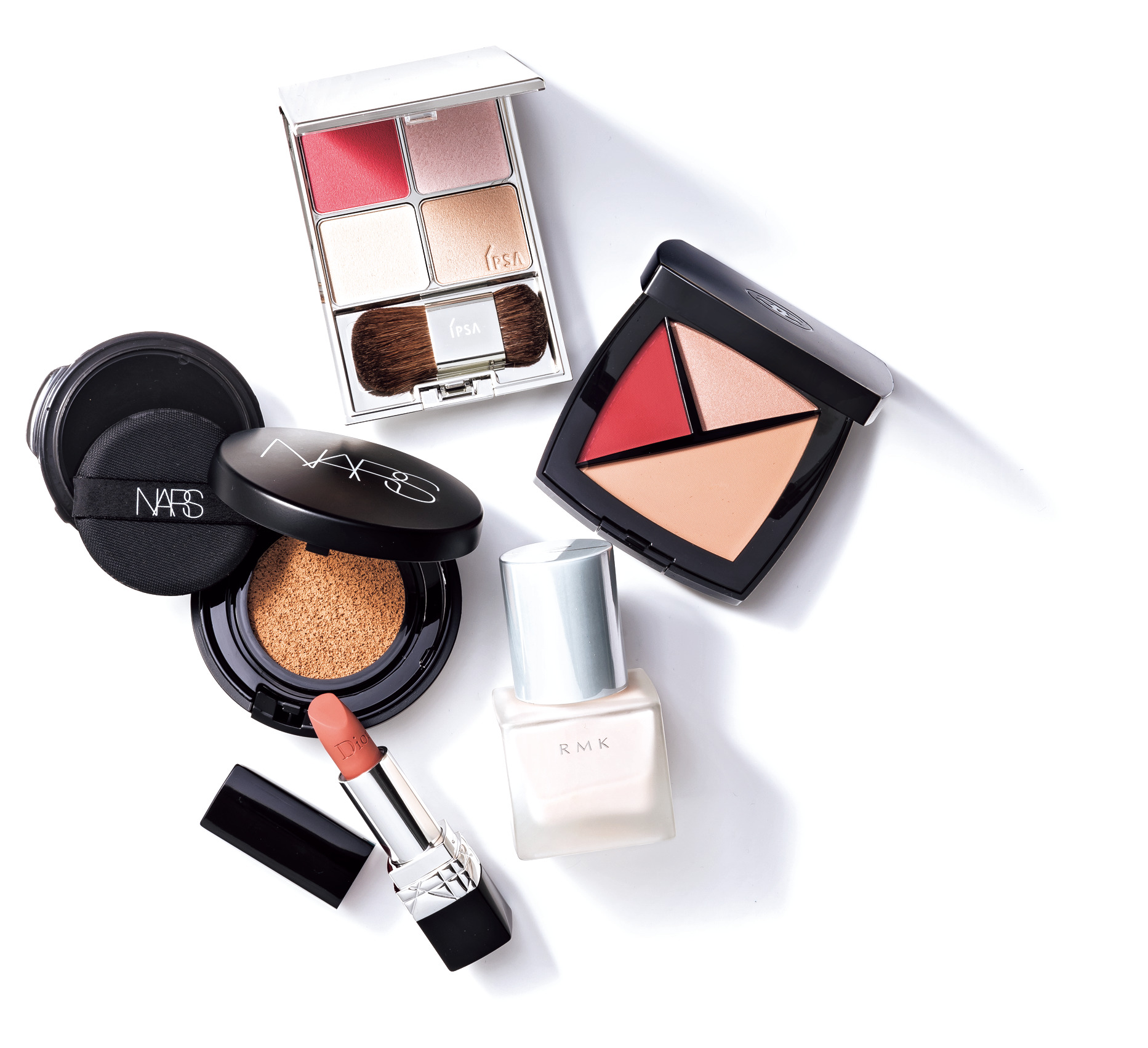 [上から時計回りに]デザイニング フェイスカラーパレット101-001RD¥5,800(イプサ) 練りチーク、ハイライト、コンシーラーのセット。パレット エサンシエル175¥7,000(シャネル) 厚化粧に見えないカラーレスタイプ。RMK メイクアップベース30㎖¥3,700(RMK Div.) 品よく仕上がるマットなベージュ。ルージュ ディオール525 1月1日限定発売¥4,200(パルファン・クリスチャン・ディオール) 薄付きのに肌の色むらをカバー。NARS アクアティックグロー クッションコンパクト 6805 SPF23/PA++(セット価格)¥6,300(NARS JAPAN)