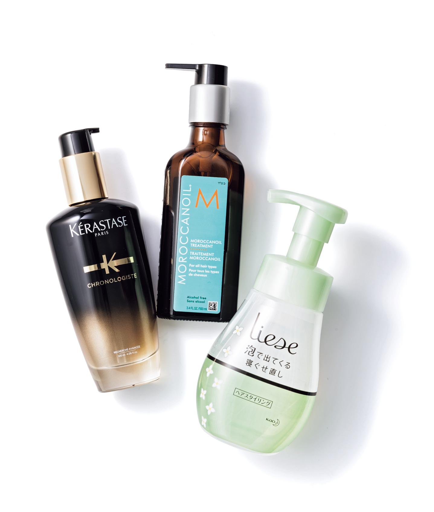 [右から]つぶれた根元を簡単に直すことができるフォーム。リーゼ 泡で出てくる寝ぐせ直し200㎖オープン価格(花王) 仕上げに全体に健康的な輝きを与えてくれる、ベトつかないオイル。モロッカンオイル トートメント100㎖¥4,300(モロッカンオイル ジャパン) 毛先のパサつきをおさえてくれるオイル、CH ユイル クロノロジスト120㎖¥5,500ヘアサロン専売品(ケラスターゼ)
