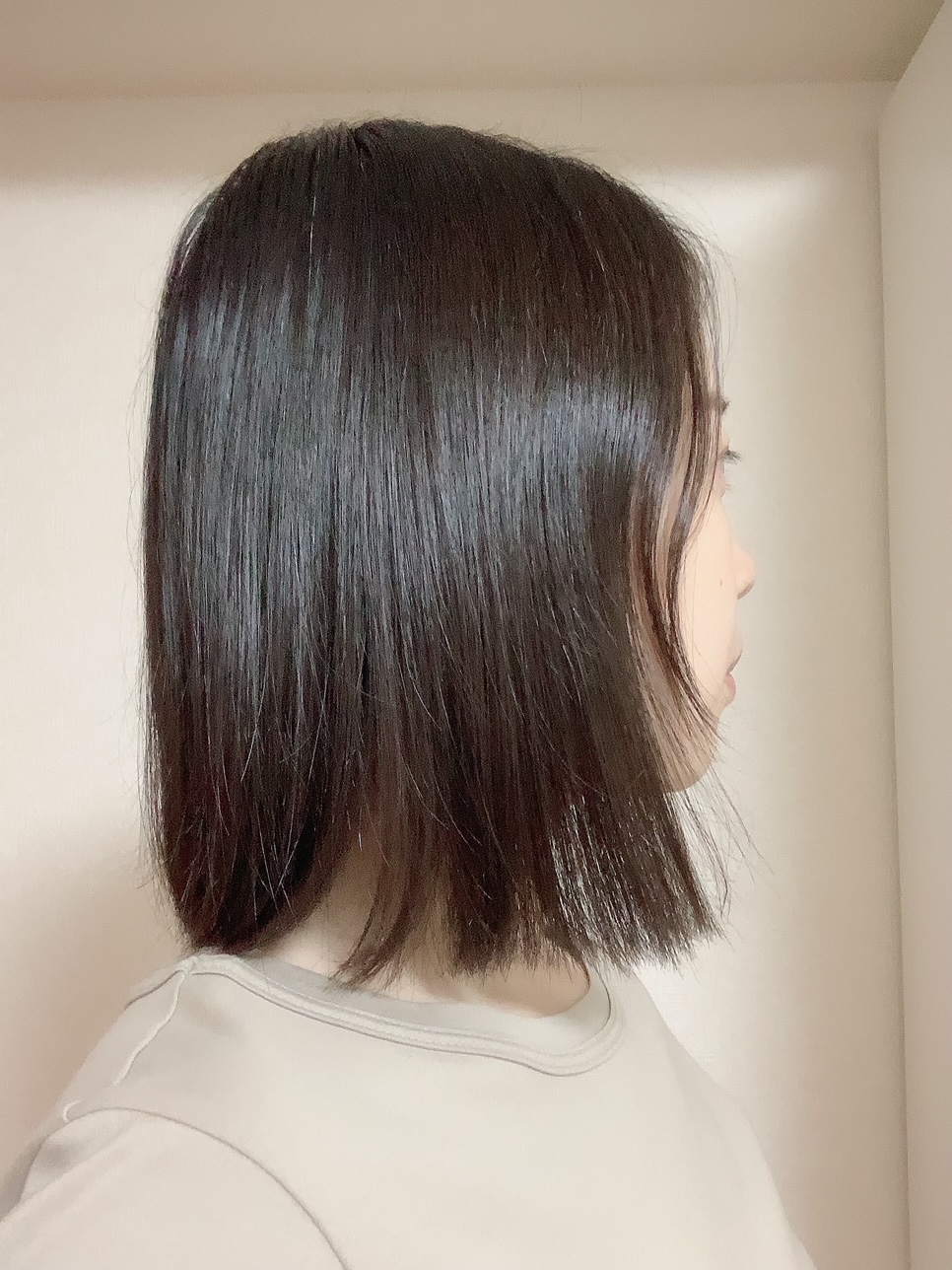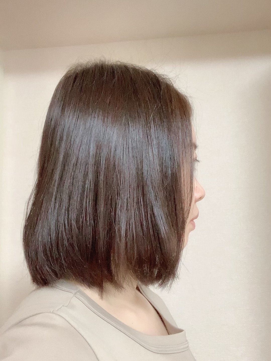【after】やや暗めの色を選んだこともあり、ほんのりと染まった感じですが、翌日編集部で「髪染めましたか?」と聞かれるくらいには変化が。前髪のあたりがとくに明るかったので、最初にカラー剤をつけたところに多少色ムラがあったかもしれません。でも「やっちまった!」感は全くなく、初めてのセルフカラー&超不器用な私でもこのクオリティができることに感動しました。ほんのり見えていた白髪も消えました!