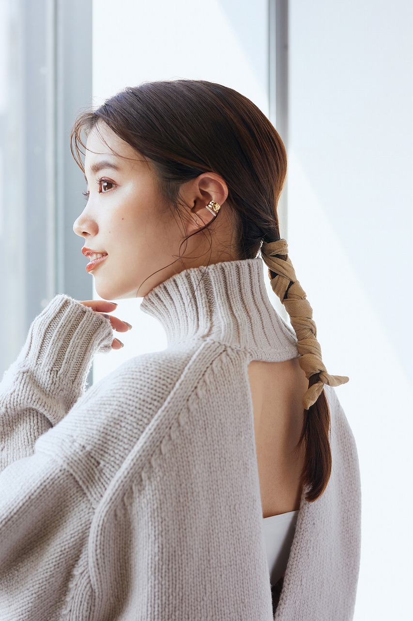 ほっこりしがちなタートルネックニットの日に、どこかモードで洗練された雰囲気が加わるポニー。静電気による髪の広がりも抑えられる、という実用的なメリットも。