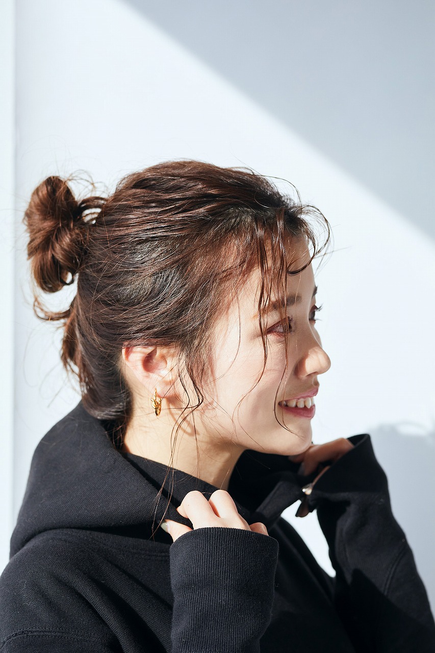 フーディのカジュアルな雰囲気によく似合う、ヘルシーなアップスタイル。わざと逃がした毛先や無造作な後れ毛が、元気だけで終わらない、ニュアンスのある表情を作ります。