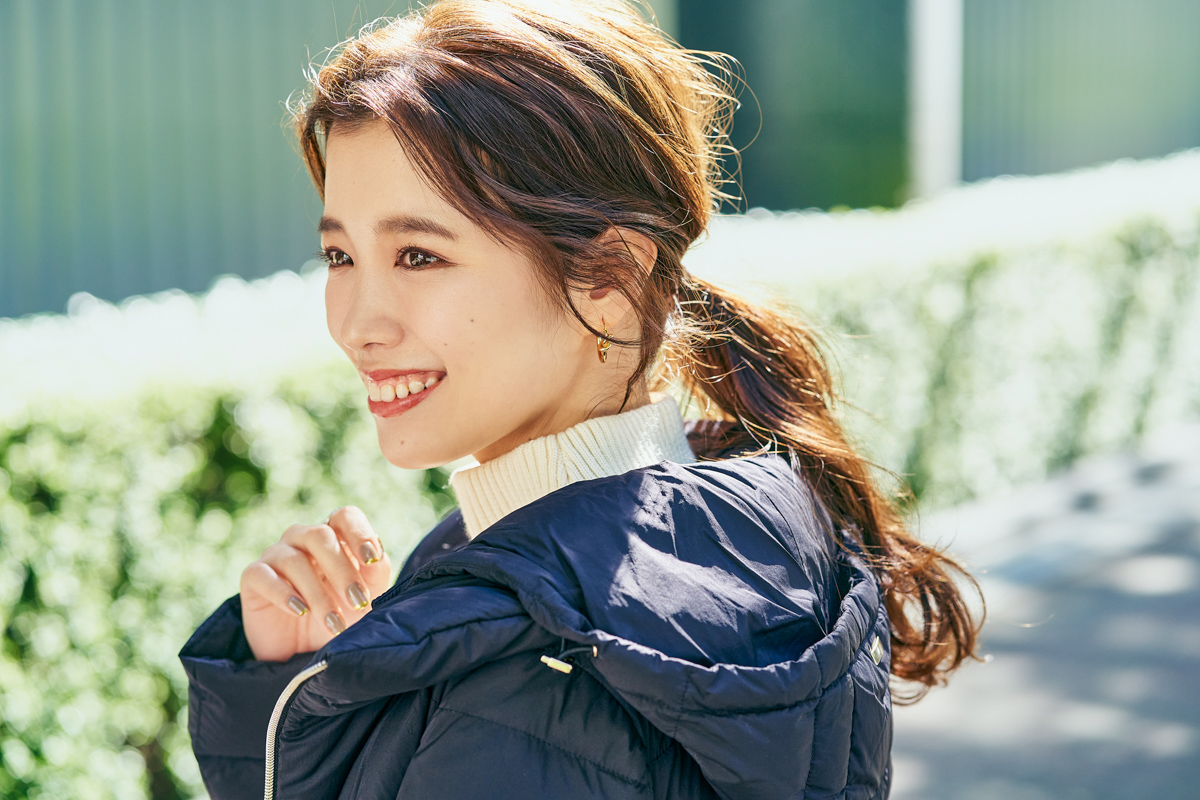 スポーティなダウンには低めのひとつ結びでゆるさを演出