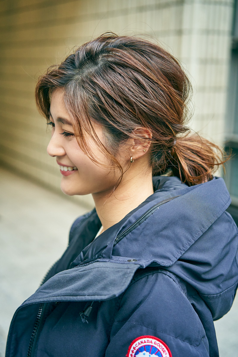明るめなカラーなのもあって、カジュアルなアウターには低めのまとめ髪でゆるさと大人っぽさを出します。手グシで低めの位置でひとつ結びにし、顔周りの束感をキープしつつ、カールが取れないように軽めのワックスをつけておくのがポイント。