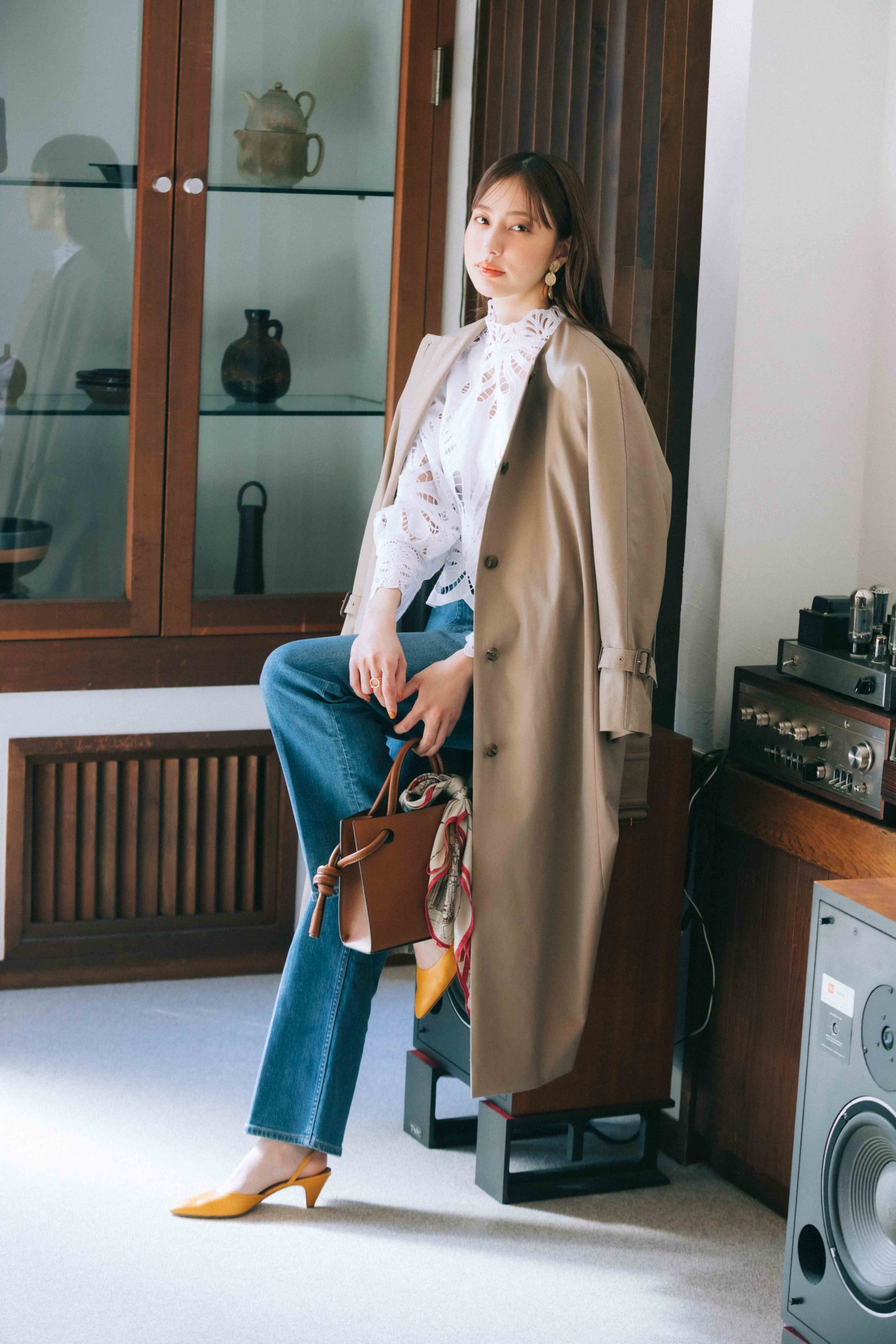 デニムパンツ¥13,000(ヘルシーデニム/ゲストリスト)コート¥54,000(ANAYI)ブラウス¥39,000<ルル・ウィルビー>イヤリング¥5,000<アルアバイル>(ともにアルアバイル)バッグ¥26,000(オルセット/オルサ)スカーフ¥12,000(マニプリ)パンプス¥29,000(ファビオ ルスコーニ/ファビオ ルスコーニ ルミネ有楽町店)リング¥11,400(ジゼルベー/ZUTTOHOLIC)