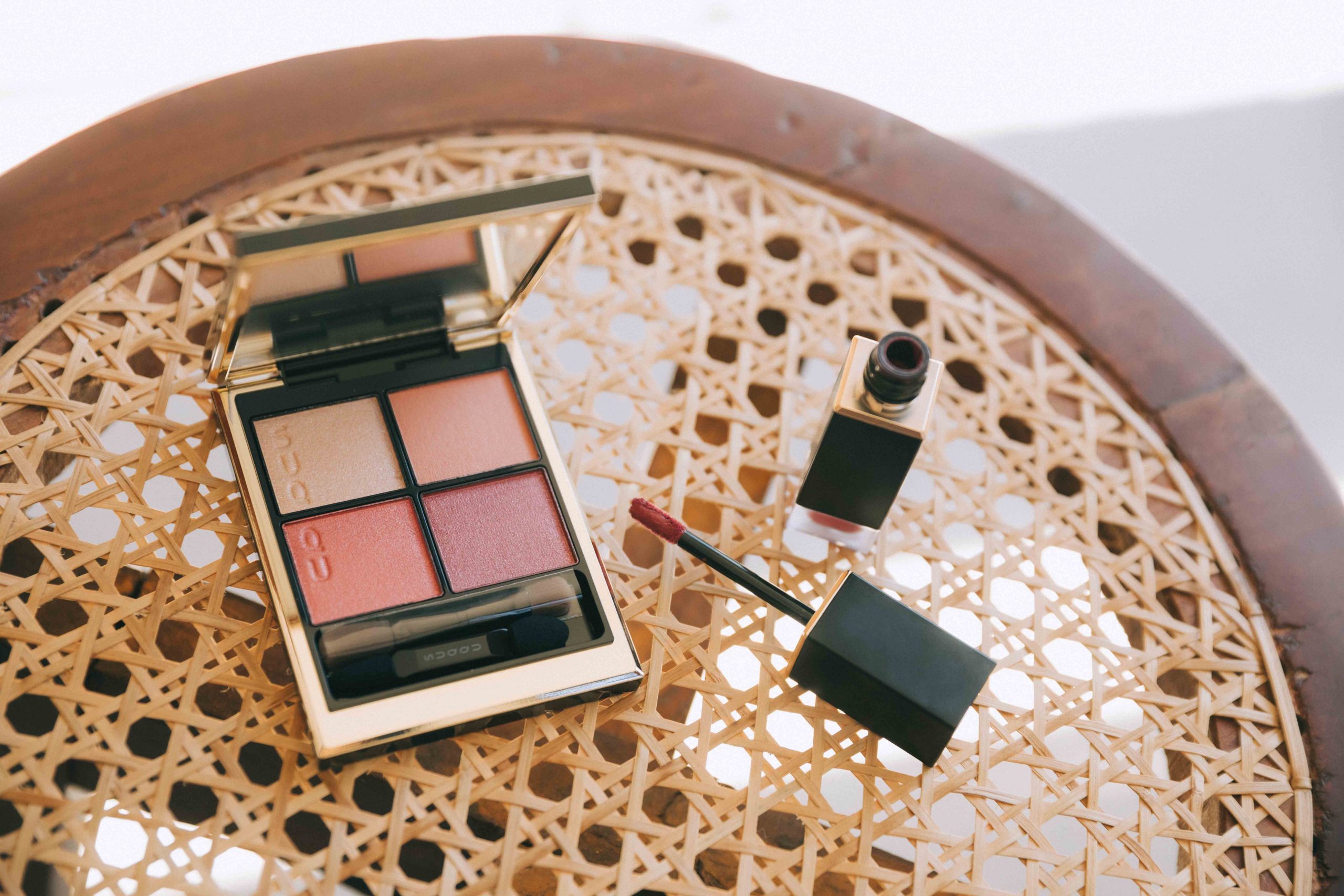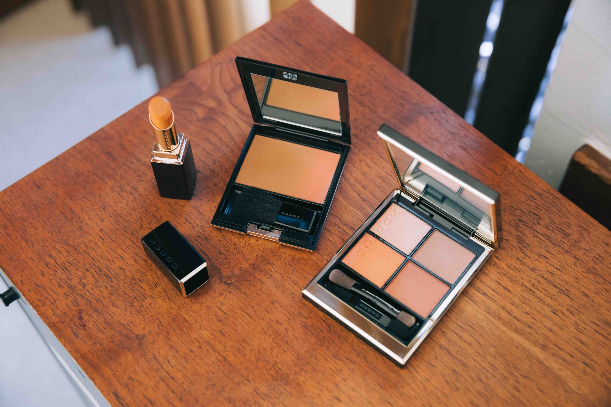 【右】温かみのあるオレンジ系パレット。しっとりした質感でまぶたに密着し、色を重ねても透明感を損ないません。シグニチャー カラー アイズ 02 ¥7,000【中】骨格を引き締めて小顔に見せるブラウンチーク。ピュア カラー ブラッシュ 11 ¥5,500【左】深みのあるオレンジイエローで即洒落顔! 濃密バームがうるおいを与えながら、ツヤっぽいヘルシーな仕上がりに。モイスチャー リッチ リップスティック 12 ¥5,000(すべてSUQQU)