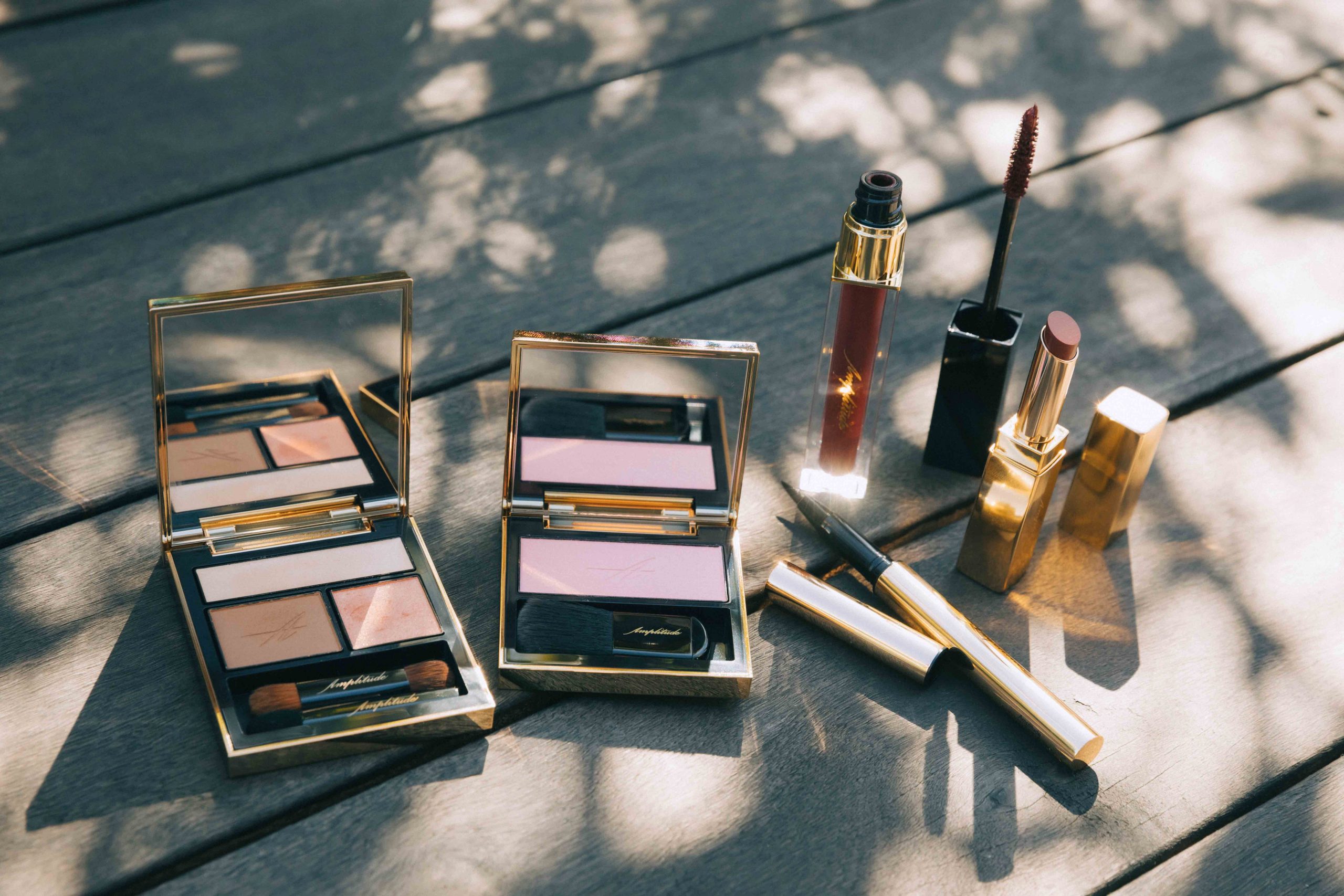 【上段・右から】クリームとパウダーの2つの質感を重ねることで、陰影のある印象的な目元へ。アンプリチュード コンスピキュアス ダブルアイズ 07 ¥6,000 自然な血色をプラスするイエローオレンジ。シルキーなテクスチャーが上品。同 コンスピキュアス モノチークス 03 ¥5,800 【下段・右から】表面はマットなのに、ベースはリップクリームのようなうるおい。同 コンスピキュアス マットリップス 05 ¥4,300 カラーライン初心者も挑戦しやすい、黒に近いモスグリーン。同 ロングラスティング リキッドアイライナー 05 ¥4,300(すべてアンプリチュード)