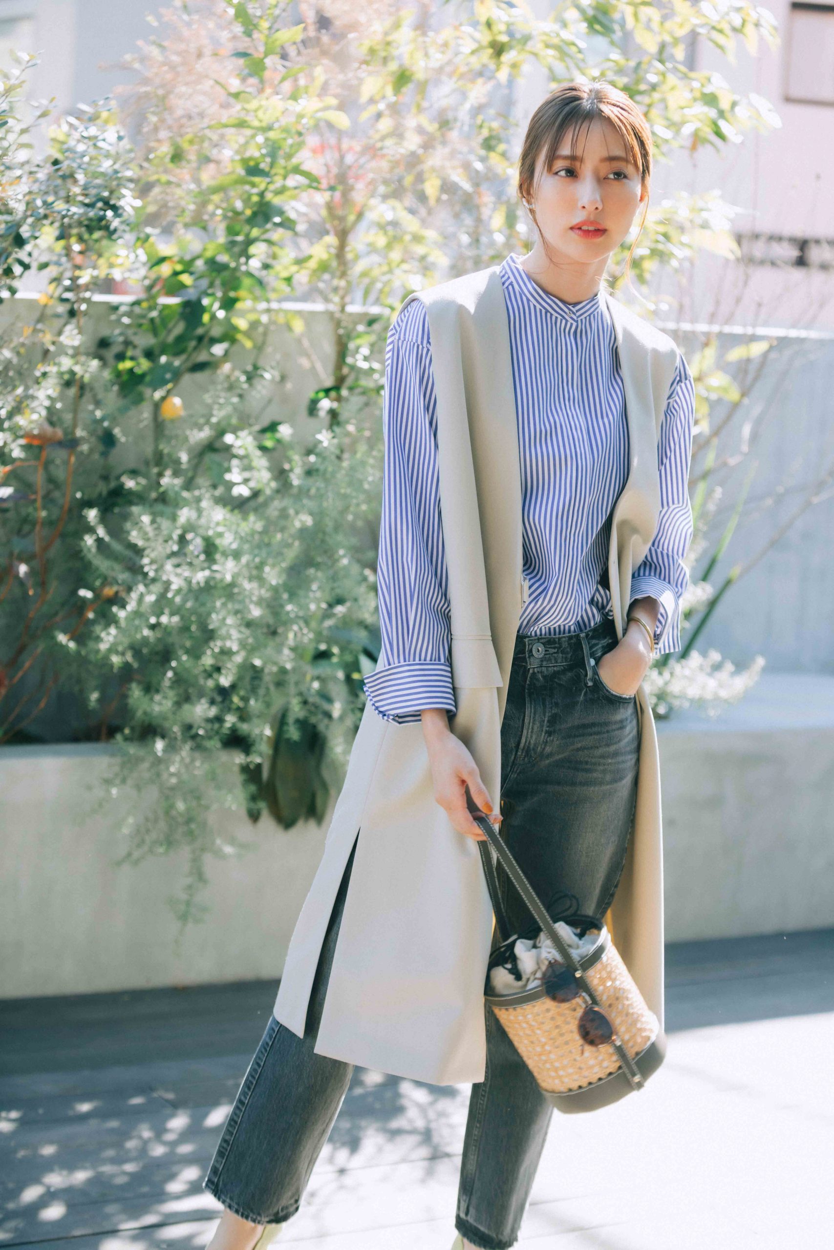 ストライプバンドカラーシャツ¥18,000ジレ¥24,000(ともにユナイテッドアローズ/ユナイテッドアローズ 青山 ウィメンズストア)デニムパンツ¥23,000(アッパーハイツ/ゲストリスト)バッグ¥24,000<マルシェ>パンプス¥44,000<ネブローニ>(ともにフラッパーズ)サングラス¥38,000(アイヴァン/アイヴァン PR)[右]片耳イヤークリップ¥17,800[左]片耳ピアス¥10,800(ともにステラハリウッド)バングル¥10,920(チビジュエルズ/チビジュエルズ・ジャパン)