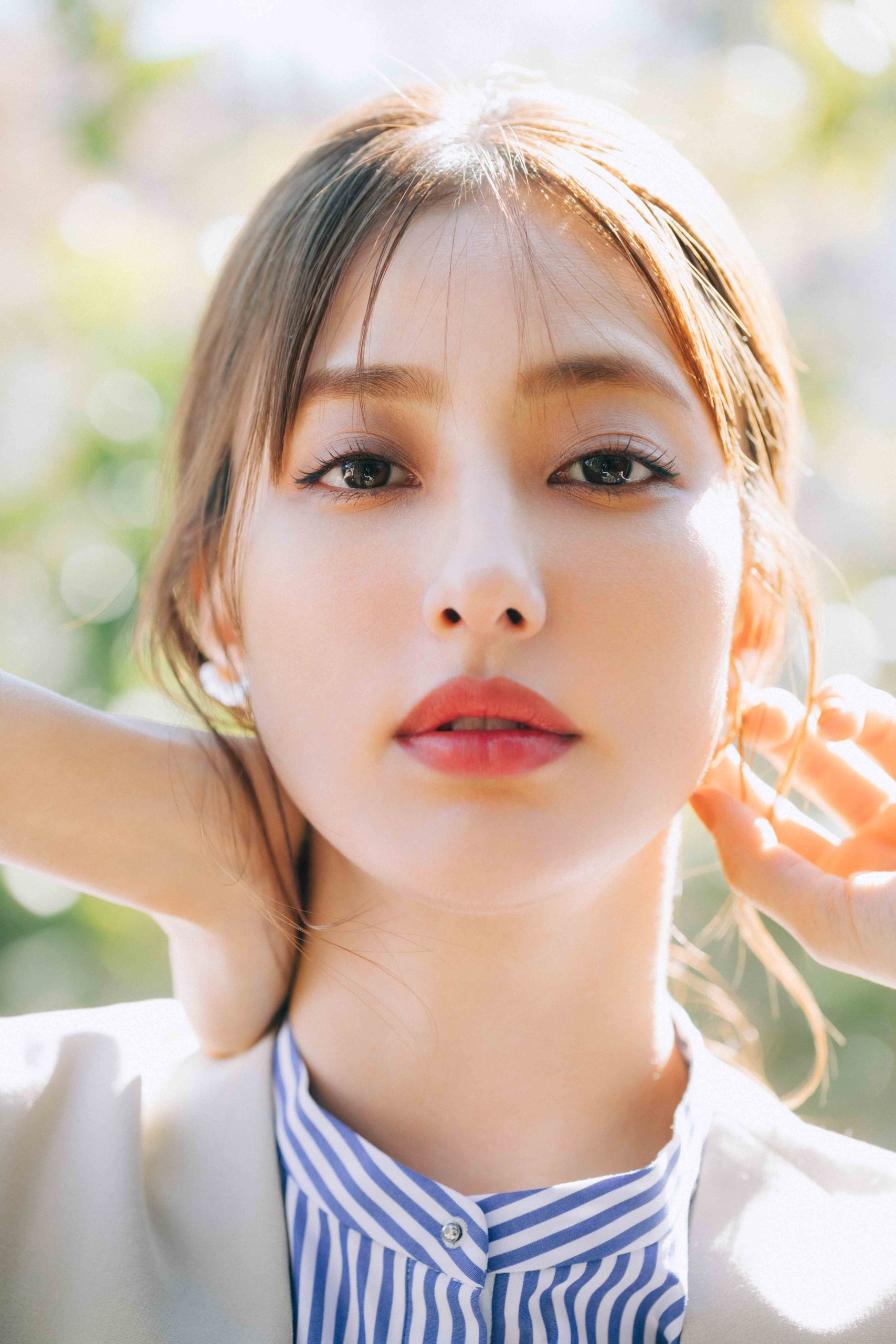 爽やかな春の日に着たくなる、ブルーのストライプシャツ。デニムと合わせたカジュアルな装いには、オレンジリップのヘルシーさが相性抜群! リップはマットな質感で、鮮やかなオレンジを品よく導くのがポイント。
