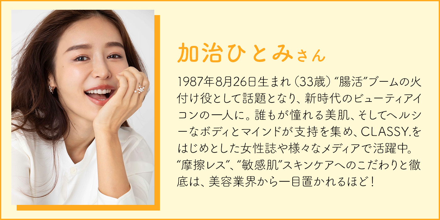 「春は花粉やほこり、乾燥などで肌がゆらぎやすい時期。しかも今はマスクの摩擦も気になるところ…。だからこそ私は“摩擦レス”で、肌負担が少ないクレンジングを選ぶのを意識しています。今はミルクタイプのものがメインで、カバーマークのクレンジングは3年ほど愛用中です。トリートメント クレンジング ミルクの好きなところは、肌の上での滑りがよく、擦らずにメークオフできるところ。本当に力は入れていないのに、マスカラまで落としてくれるんです! しかも洗い上がりは「スキンケアですか?」というくらい、もちもちになるのがお気に入り♡ 過酷な時期でも安定した肌状態をキープするには、やっぱり肌のベースを整えることが大事だと思います。クレンジングなどの“落とすケア”もその一つ。摩擦や乾燥といった肌荒れの原因を取り除いて、ベースを整えてくれるようなアイテムを選んでいきたいです」(加治ひとみさん)