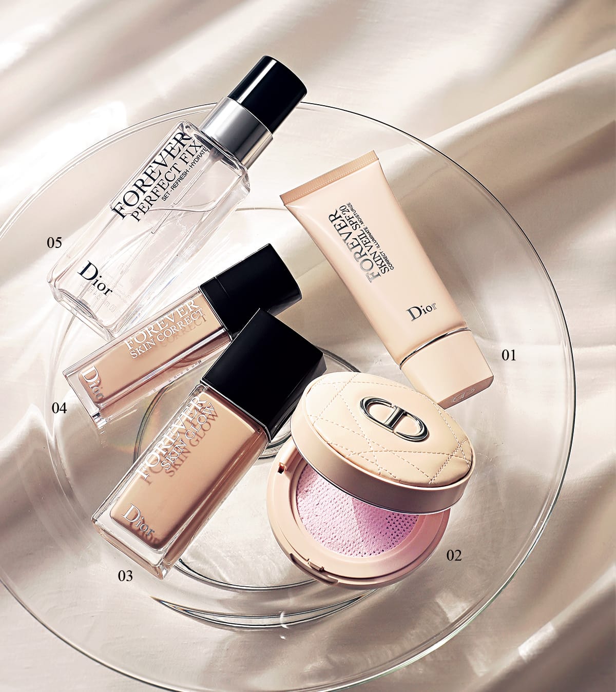 01 保湿、色ムラ補整、化粧もち…ディオール独自のフローラルサイエンスから生まれた美肌下地。ディオールスキン フォーエヴァー スキン ヴェール SPF20/PA++ 30㎖ ¥6,380 02 水系成分が25%を占める革新的なルースパウダーは、みずみずしくサラサラの感触。ディオールらしいエレガントなパッケージにも注目。同 クッション パウダー 全4色 ¥7,700 03 スター製品であるスキンケア感覚のファンデーション。一日中肌を保湿してくれるうえにくずれにくいから、マスク生活の日々にも心強い。同 フルイド グロウ SPF35/PA++ 30㎖ 全8色 ¥6,600 04 まるで第二の肌のように、厚塗り感なく肌トラブルを一瞬でカモフラージュ。フローラル エキスがたっぷり配合されていて、コンプレックスを隠すだけでなく乾燥による小じわの出現も抑えてくれます。同 スキン コレクト コンシーラー 全7色 ¥4,620 05 毎朝のメークやお直しの仕上げに。軽やかなミクロ状のミストが肌を保湿しながら、メークをしっかり定着させます。華やかで心地よいグリーン フローラル ムスクの香り。同 メイクアップ フィックス ミスト 100㎖ ¥4,950(すべてパルファン・クリスチャン・ディオール)