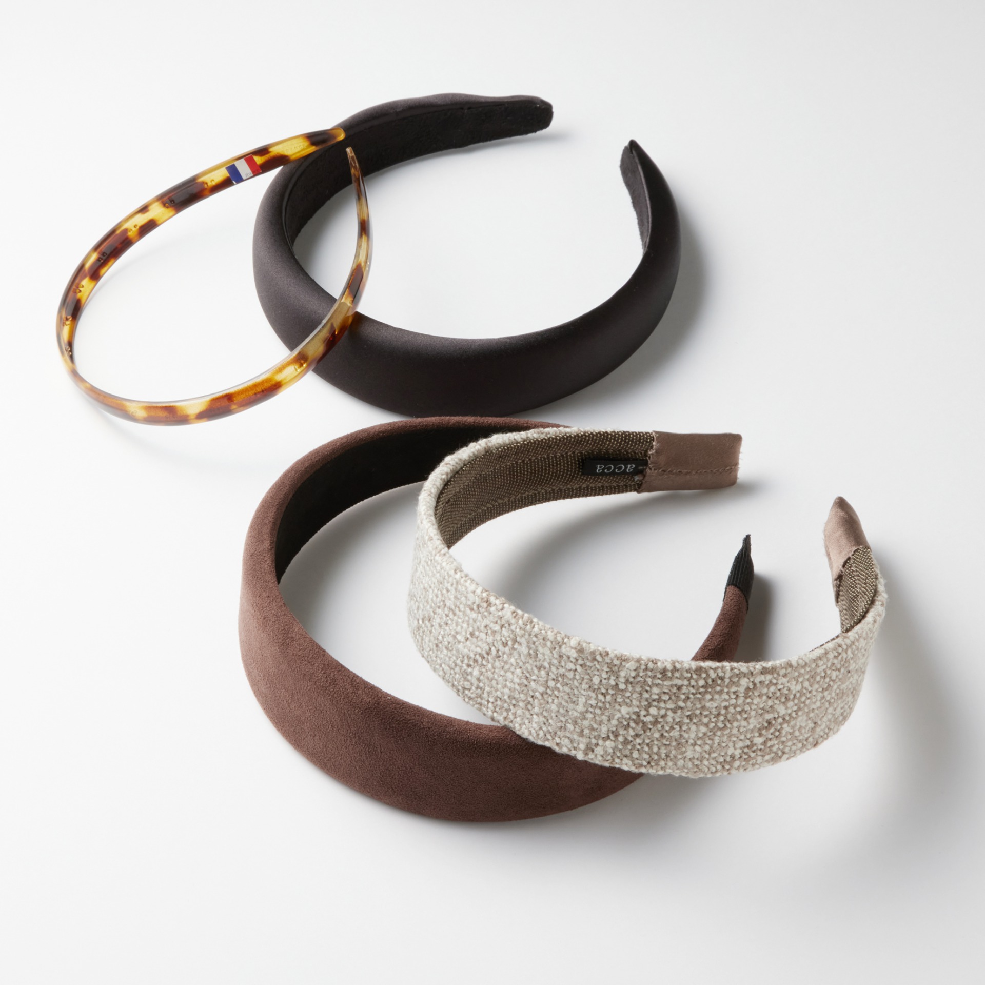 [右下]ヘッドドレス感覚で楽しみたいなら、素材感のある太めのデザインがぴったり。ツイードカチューシャ¥12,000(acca/acca 青山店)