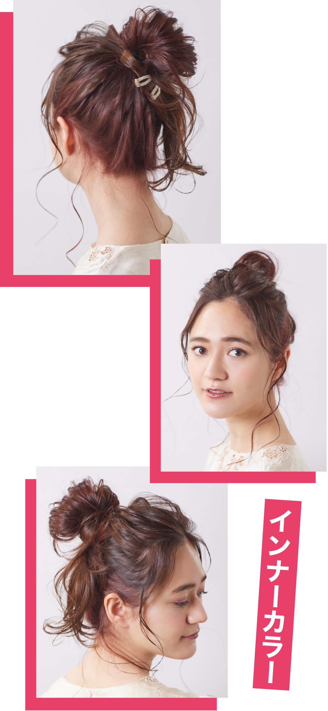 内側の髪を持ち上げ、高い位置でまとめるアレンジはインナーカラーが映えるヘアアレンジの代表格。しかも「シニヨン」のカジュアルさがOFFの気分にマッチ。かつ、襟足の「ピンク」でふわっとと可愛く縁どれば、フェミニンな雰囲気も高まります。ふわふわさせてもピンクの持つツヤめきで、ボサッとは決してならないからキレイ見えもお約束。たっぷりルーズにくずしてもどこか女性らしいんです。
