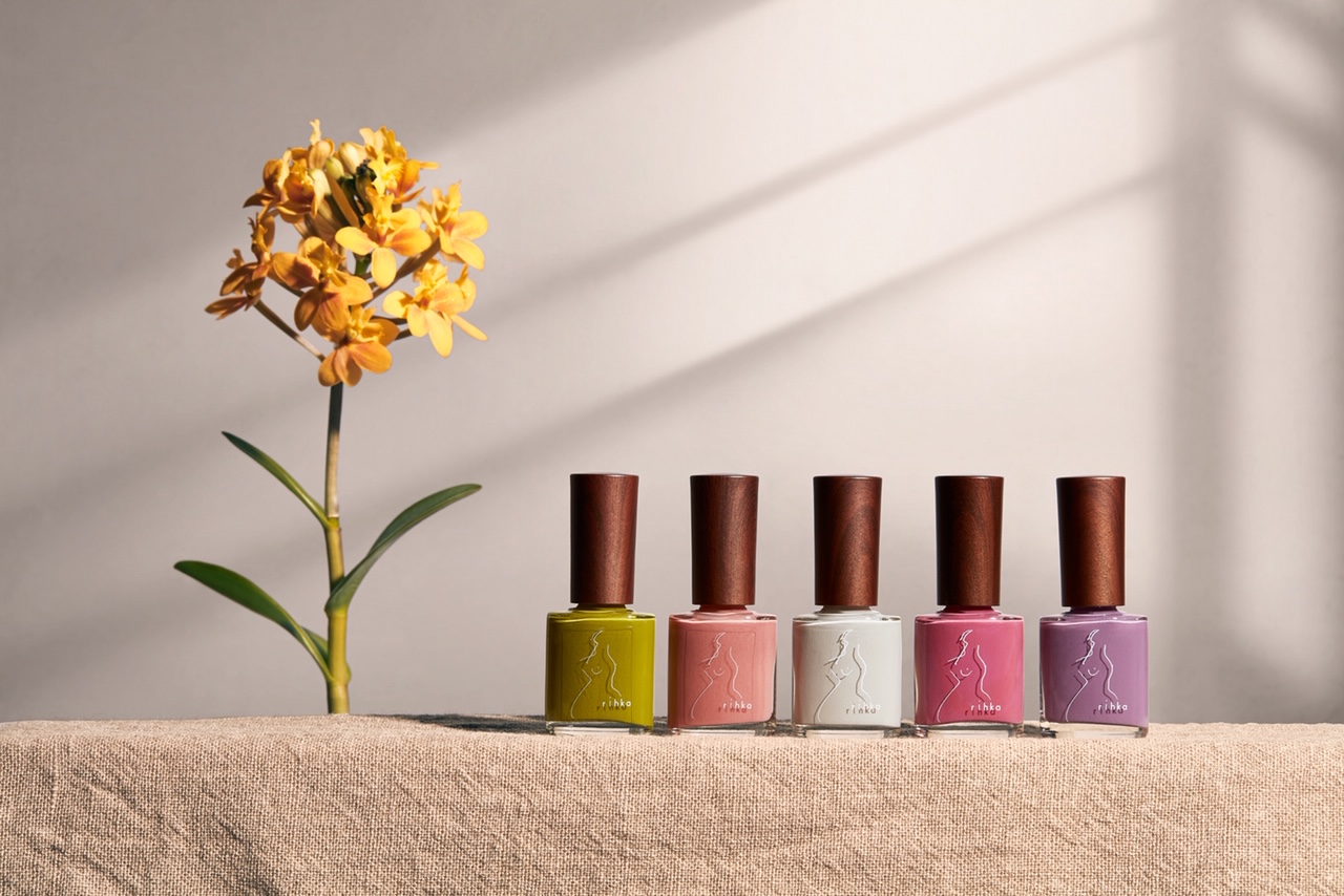 定番人気を集めるのは、ジューシーなパープルピンクや、やわらかなウォームグレーなど、他のブランドでは見つからない絶妙カラー。見たままの発色が叶うので、アクセントカラーも取り入れやすい。左からrihka ネイルポリッシュ mint tea、coussinet、cashmere、fig、serene各¥2,970(すべてrihka/newn)