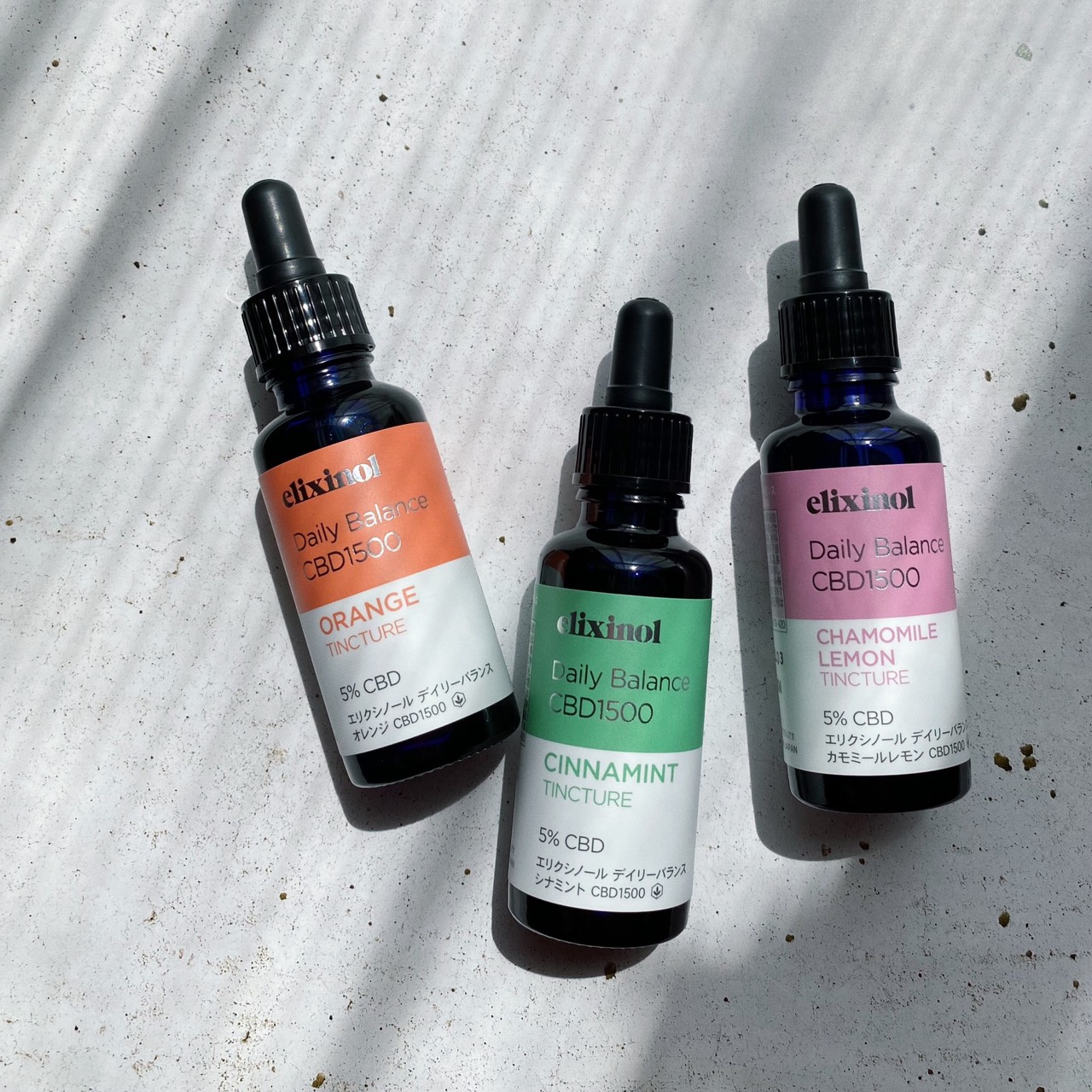 CBDアイテムを多く展開している「ビープル バイ コスメキッチン」でも、ロングセラーのブランド。CBD初心者でも飲みやすいように、植物やフルーツのフレーバーをプラス!ジューシーな風味の「オレンジ」、ミント×シナモンの組み合わせがクセになる「シナミント」、爽やかで心地いい「カモミールレモン」の3種類。CBDの含有量も選べます。エリクシノール デイリーバランス オレンジ/シナミント/カモミールレモン 30ml(CBD1500mg)各¥12,960(すべてビープル バイ コスメキッチン)