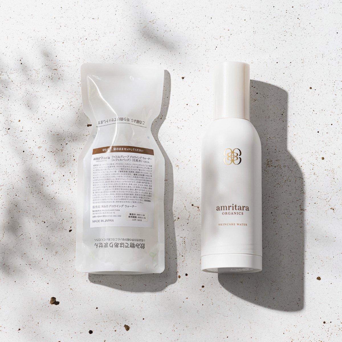 「肌にすっとなじむ、さっぱりとしたつけ心地が私好みなのですが、化粧水は詰替え用ボトルがあったりと、地球環境を考えているところも好きです。また、国産のオーガニックスキンケアブランドというところも安心感も使っている理由のひとつ。これは農薬不使用の玄米と日本山ぶどうの樹液でできています」(茜ちゃん)ライス & グレープ グロウイング ウォーター[レフィルと空ボトルのセット]¥5,565(アムリターラ)