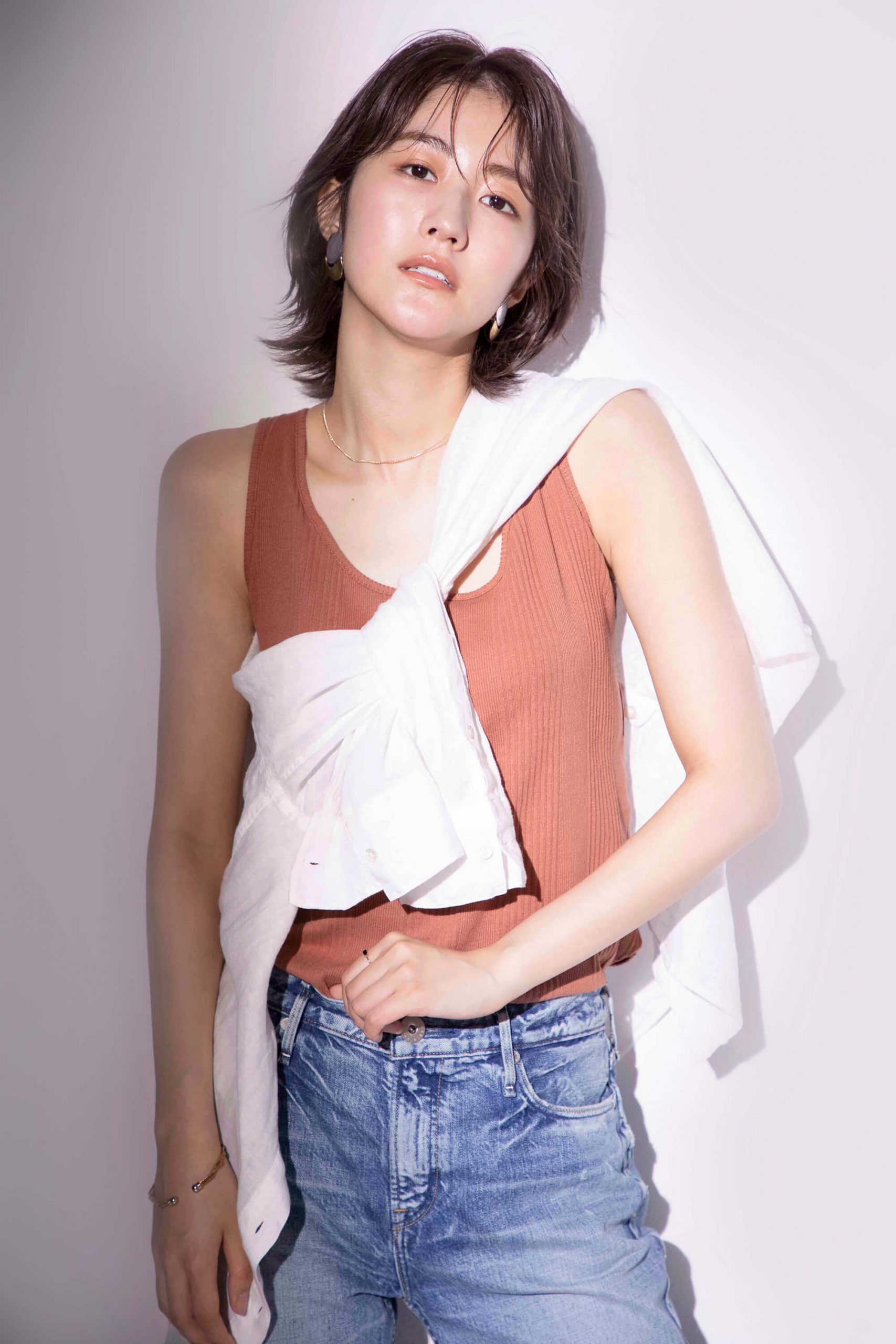 カップ付きタンクトップ¥10,780シャツ¥22,000(ともにヤヌーク/カイタックインターナショナル)デニムパンツ¥25,300(アッパーハイツ/ゲストリスト)サンダル¥17,600(ダイアナ/ダイアナ 銀座本店)イヤリング¥11,000<マージョリー・ベア>バングル¥6,050<ナイン>(ともにココシュニック オンキッチュ 有楽町マルイ店)ネックレス¥48,400リング¥19,800(ともにココシュニック)