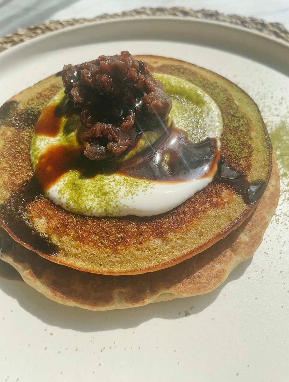 「食物繊維たっぷりのオートミールと米麹が入っている『UPBEET!Tokyo』のパンケーキミックスを使いました。さらに抗酸化作用があってアンチエイジング効果もあると言われている、抹茶パウダーもプラス! 裏技ですが、白味噌を入れても甘くなって美味しいです。こんな風にちょっとした工夫で、スイーツを食べる時も腸活に! この日のトッピングは自分で作った豆乳ホイップクリームと、あずき、黒蜜にしました」(かぢちゃん)