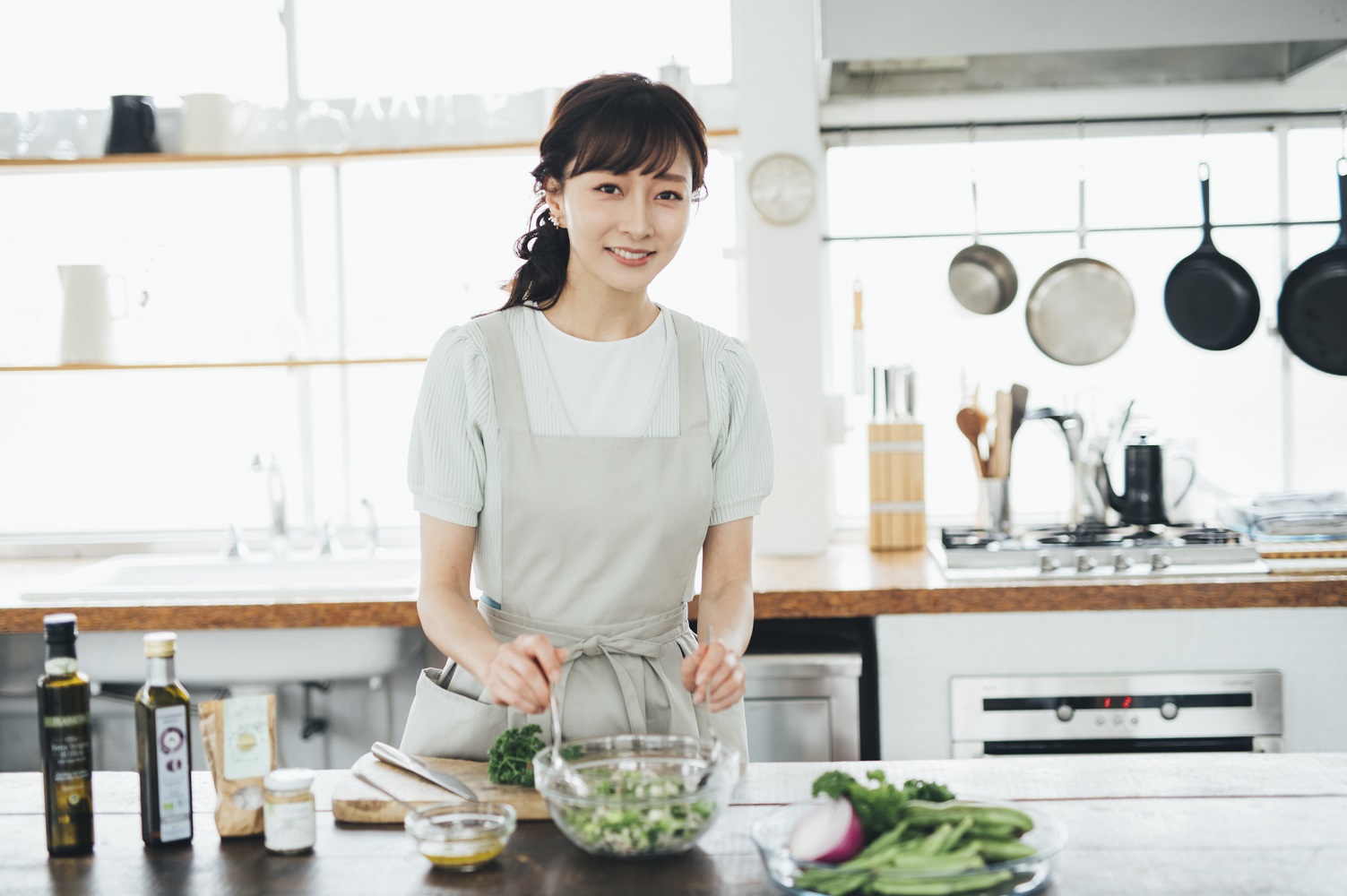 「普段愛用しているのはこの4品。マルドンシーソルトはよく使っているお塩のひとつ。燻味塩はお肉を焼く時に使うと風味が出ます。キヨエのオリーブオイルはフレッシュでおいいしいのでお気に入り。酸化する前に使い切れる小さめのボトルもポイントです。無添加のお味噌は海藻を入れたお味噌汁を作る時に。発酵した味噌と海藻の繊維で腸内環境を整えます」