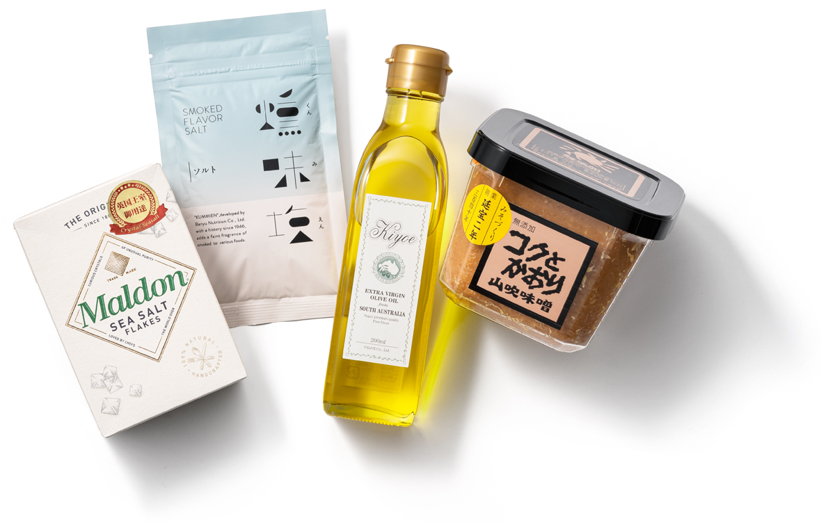 伝統の製法で作られる英国王室御用達の自然海塩。マルドン シーソルト 125g ¥464(鈴商 https://suzusho.co.jp/) 燻味塩 ソルト¥183(萬有栄養 https://banyu-e.com/) キヨエオリーブオイル 120ml ¥1,566(バロックスhttps://www.valox.jp/) 無添加 コクとかおり 500g ¥918(山吹味噌 酢久商店https://www.yamabukimiso.com/SHOP/91080/155793/list.html)