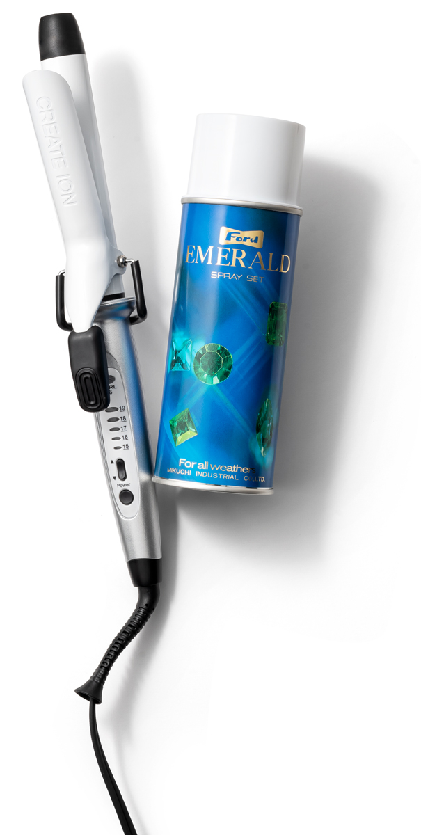 (左)ふんわりゆるやかなカールには26mmを。クレイツイオン®カールアイロン26mm ¥9,350 (右)真彩さんが宝塚時代にかつら屋さんから勧められた、雨の日でも湯気の中でもヘアスタイルをキープできるハードスプレー。フォード エメラルドスプレー ¥1,650/三口産業