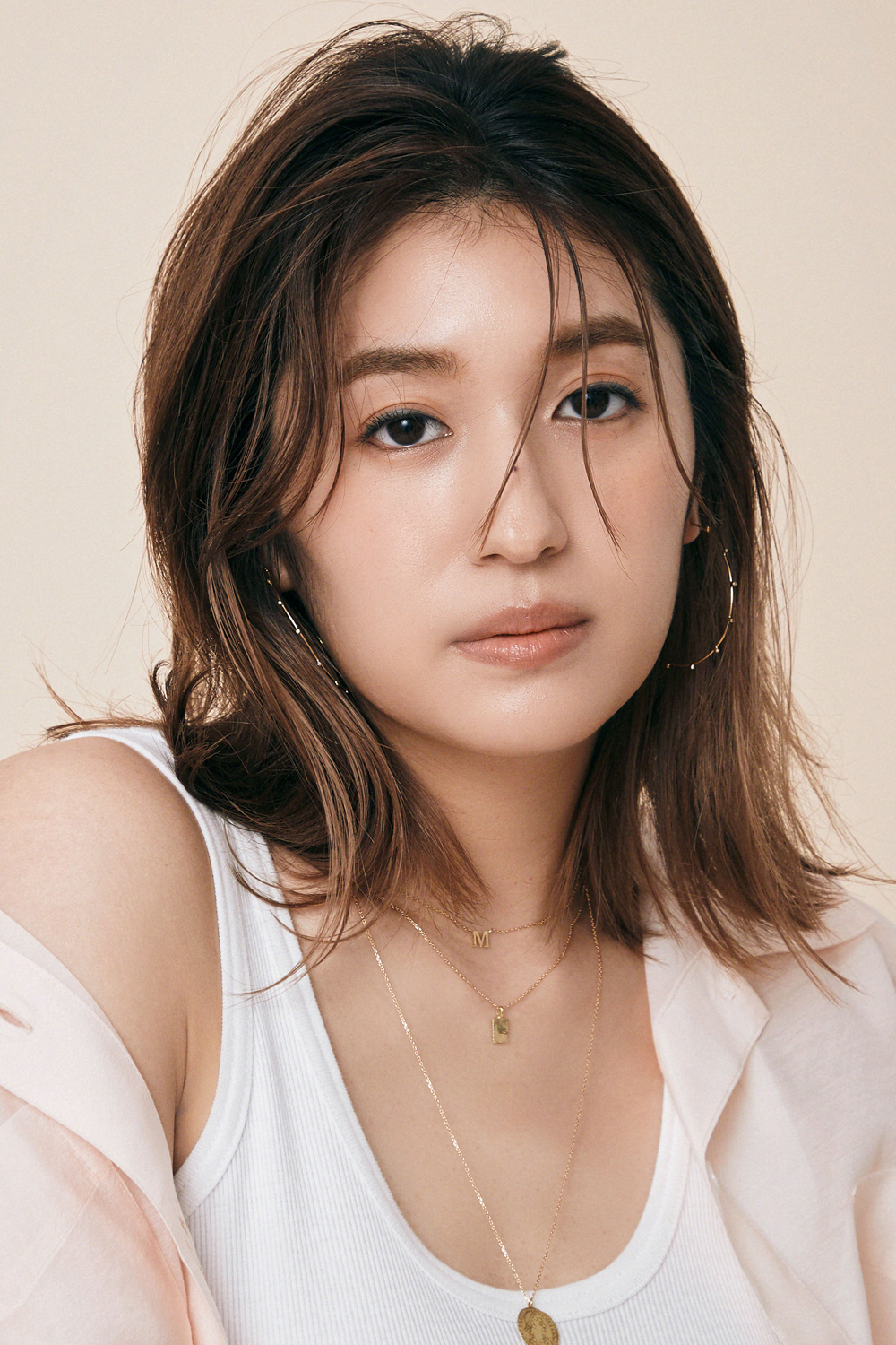 シアーシャツ¥8,800(リーバイス®/リーバイ・ストラウス ジャパン tel.0120-099-501)コットンタンク¥7,700(TW/LYDIA tel.03-3797-3200)ピアス¥121,000イニシャルネックレス¥63,800スクエアプレートネックレス¥68,200ロングコインネックレス¥126,500(すべてGIGI/ホワイトオフィス tel.03-5545-5164)