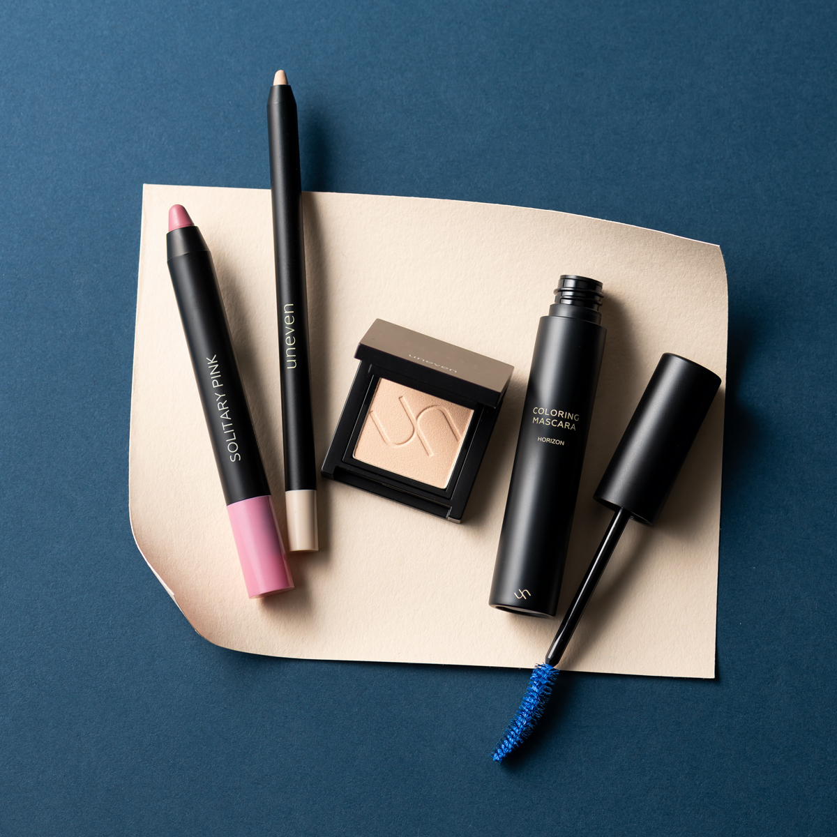 【右から】メークの主役になる鮮やかなブルーは、海と青空が交わる水平線をイメージした色。アニヴェン カラーリングマスカラ ホライゾン¥1,650 マットな質感のベージュに、キラキラ輝く大粒ラメをIN! 同 アイシャドウ クルーシャル¥1,430 白っぽいニュアンスのベージュが目元を明るく、そして印象的に。同 カラーリングソフトアイライナー スキンベージュ¥1,540 青みピンク×シルバーラメ。リップ、目元、チークなど一本でマルチユース。同 マルチスティック ソリタリーピンク¥1,650(すべてレザボア)