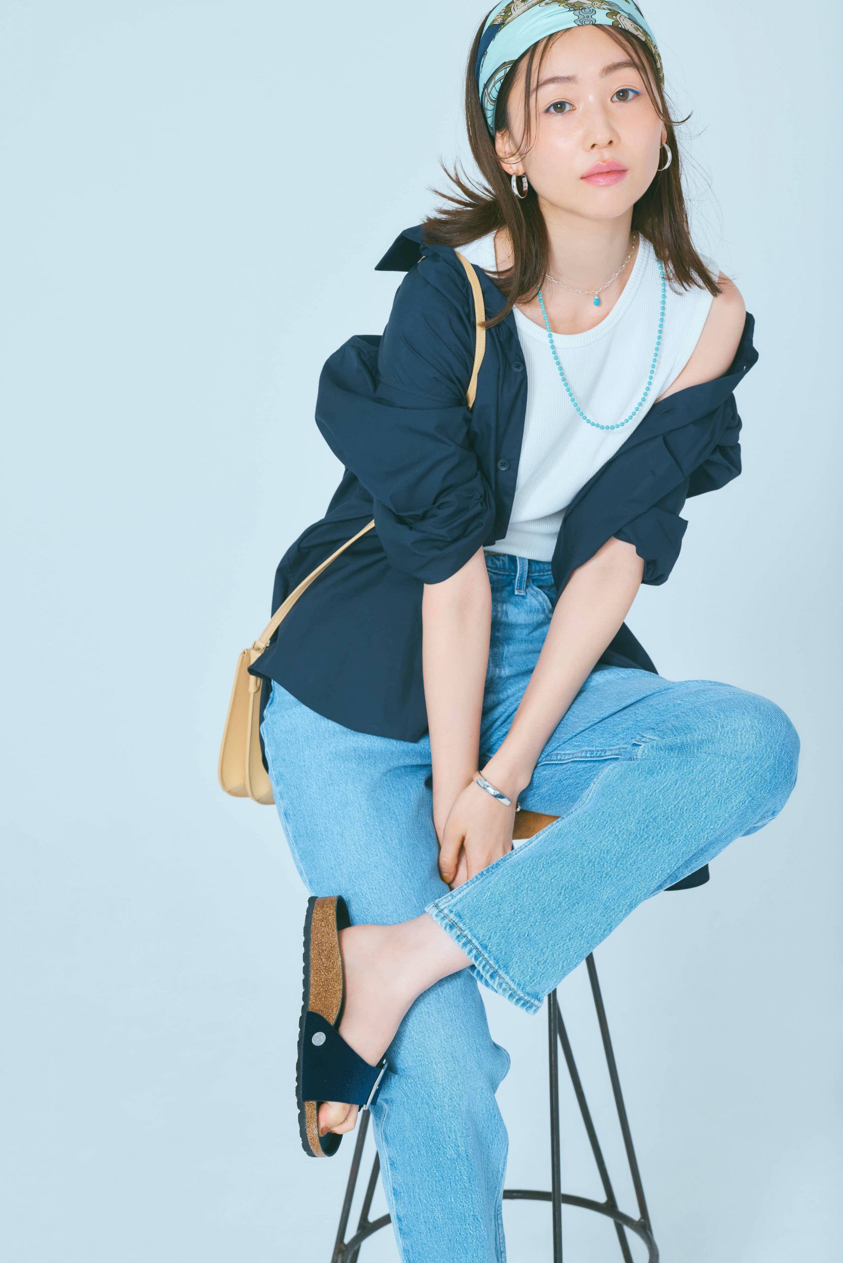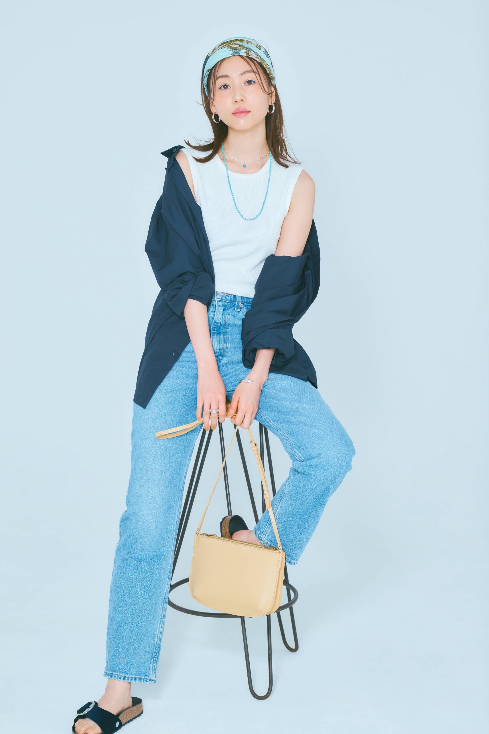デニム¥13,200(リーバイス®/リーバイ・ストラウス ジャパン)シャツ¥31,900(ATON/ATON AOYAMA)タンクトップ¥1,980(FEELING MADE/coenお客様相談室)バッグ¥51,700(A.P.C./アー・ペー・セー カスタマーサービス)サンダル¥17,600(ビルケンシュトック/ビルケンシュトック・ジャパン カスタマーサービス)スカーフ¥17,600(manipuri)ピアス¥44,000バングル¥68,200リング¥37,400(すべてSARARTH/サラース カスタマーサポート)チェーンネックレス¥15,400(エナソルーナ)ターコイズビーズネックレス¥11,550(アルポ/ZUTTOHOLIC)