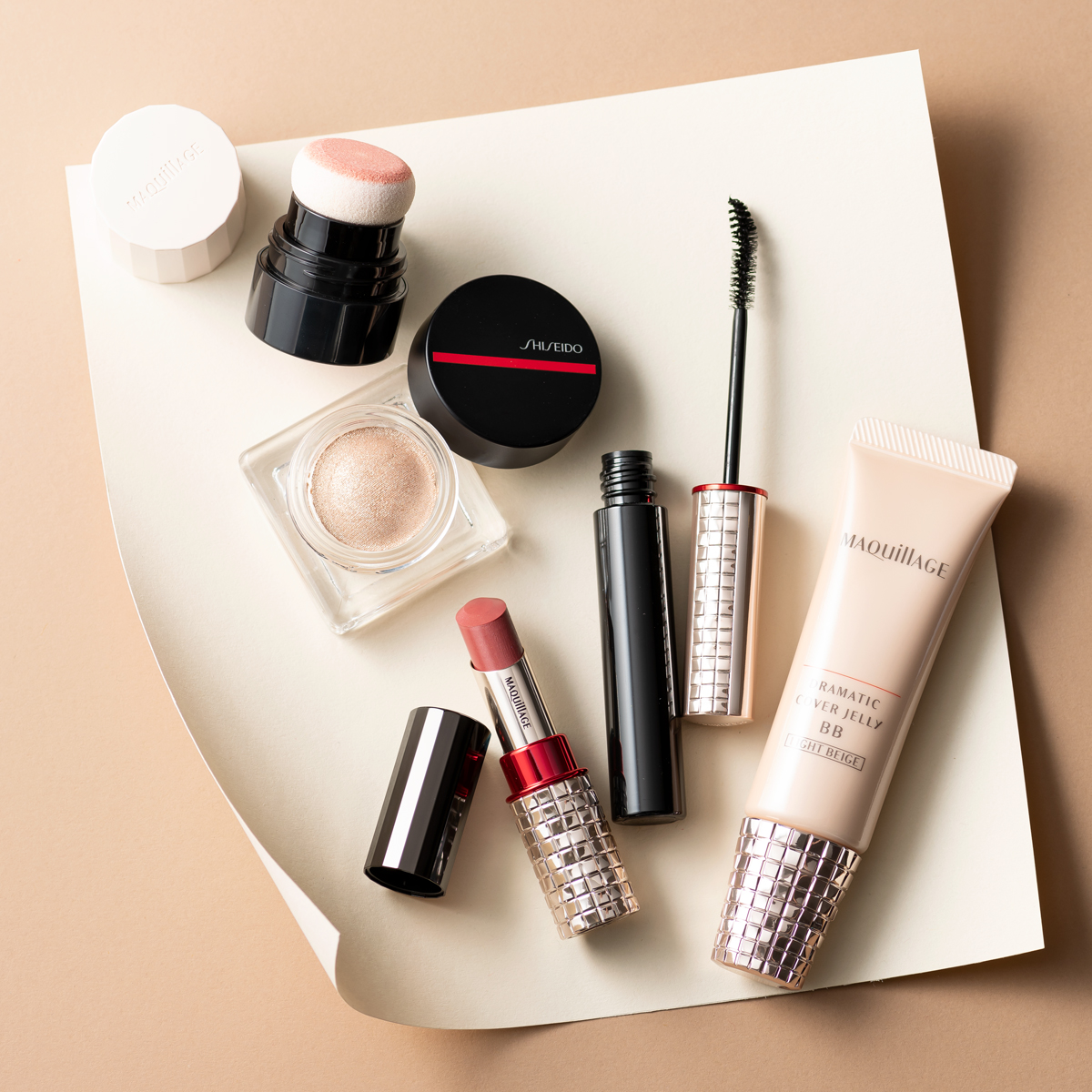 【右から】「ツヤ肌に仕上がるのに、マスクにつきにくい!」と大好評の日中用色つき美容液。この秋、毛穴やシミなどの肌悩みにアプローチするカバータイプが登場。マキアージュ ドラマティック カバージェリー BB〈SPF50/PA+++〉全2色 30g ¥3,080※編集部調べ 2段階キャッチブラシで、美シルエットを形成。細部まで上向きカール×目尻は横長ロング! 同 ビューティーシルエットマスカラ BK999 ¥3,080※編集部調べ 大人肌をくすませず、さりげなく血色感を添えるヴィンテージベージュ。同 ドラマティックルージュEX BE777 ¥3,080※編集部調べ(すべてマキアージュ) 上品な輝きを肌や目元、唇へ自由に! SHISEIDO オーラデュウ プリズム 02 ¥3,960(SHISEIDO) クリームのツヤ感とパウダーのさらさら感を両立した、簡単美肌チーク。マキアージュ ビューティースキンクリエーター(チーク)RD344 ¥2,530※編集部調べ(マキアージュ)