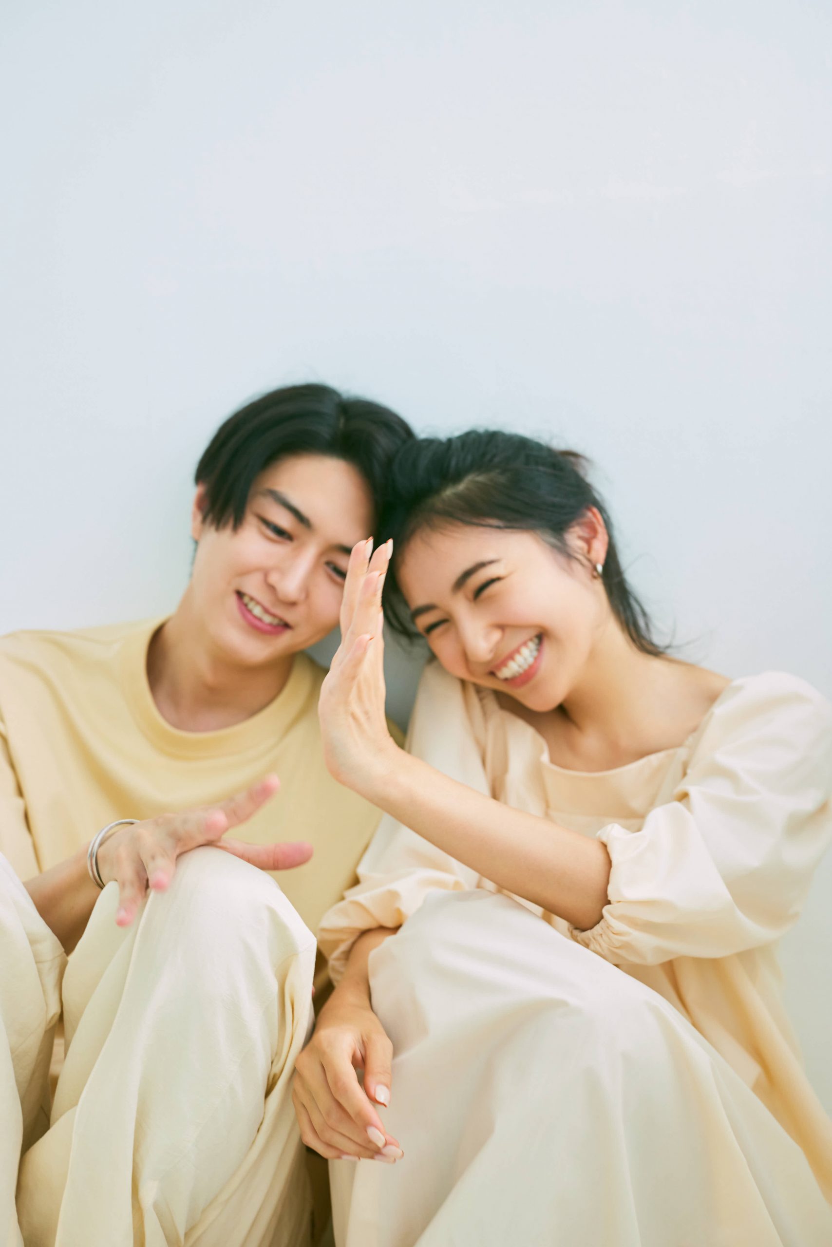 [稲葉さん]Tシャツ¥17,600 パンツ¥46,200(ともにチノ/モールド)ブレス¥37,400 リング¥19,800(ともにエウラ/グッド ルーザー) スニーカー¥7,150(コンバース/コンバースインフォメーションセンター)[桐さん]ワンピース¥12,100 サンダル¥9,900(ともにACYM) ピアス[右]¥15,400 ピアス[左]¥8,800(ともにe.m./e.m.表参道店)