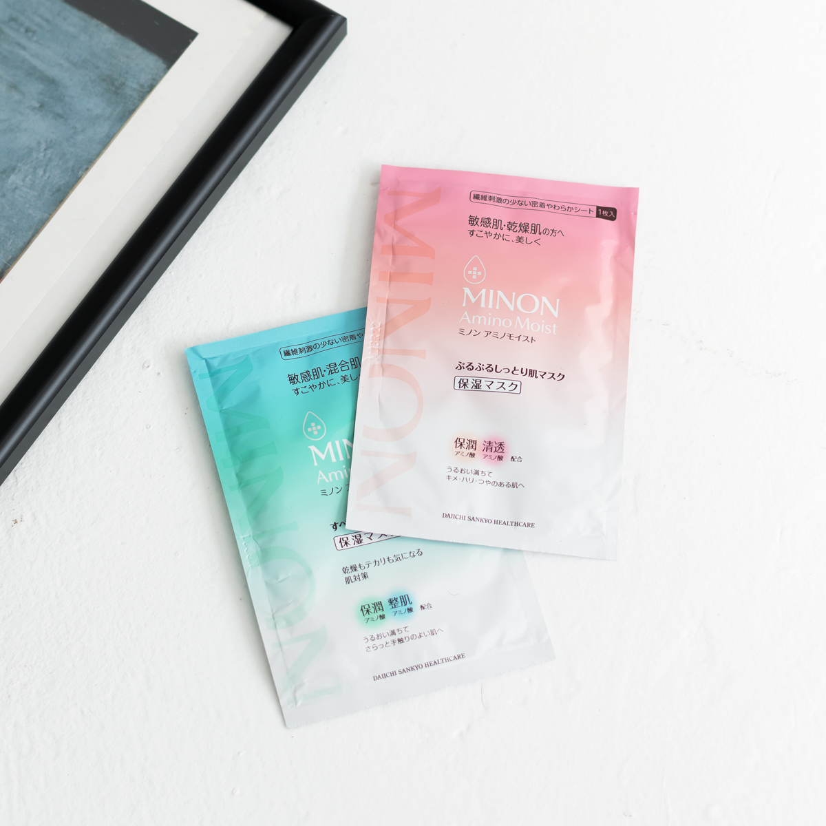 肌に吸い付くように密着するシートマスク。たっぷりのジェルが入っているのに液垂れしません。右から、ミノンアミノモイスト ぷるぷるしっとり肌マスク、ミノンアミノモイストすべすべしっとり肌マスク 各22ml×4枚入りともに¥1,320〈ともに編集部調べ〉(第一三共ヘルスケア)