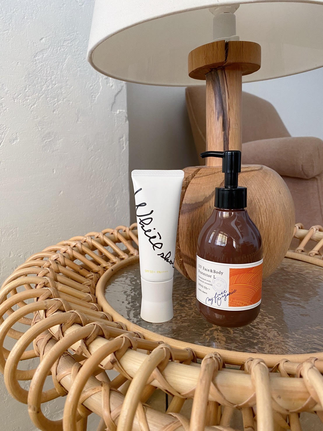 チャントアチャームのボディ用は、石鹸オフできること、みずみずしいので全身にさっと塗り広げられるところが◎。ボディは焼けないことももちろん大事ですが、ストレスフリーであることも個人的にはポイントです。毎日使うので顔と体と両方使えるので、家にいる日はコレを顔にも塗っています。以前、取材で美容皮膚科の先生から『室内にいても窓から紫外線はかなり入ってくるよ』と聞いてからは、家でも塗るようにしています」
