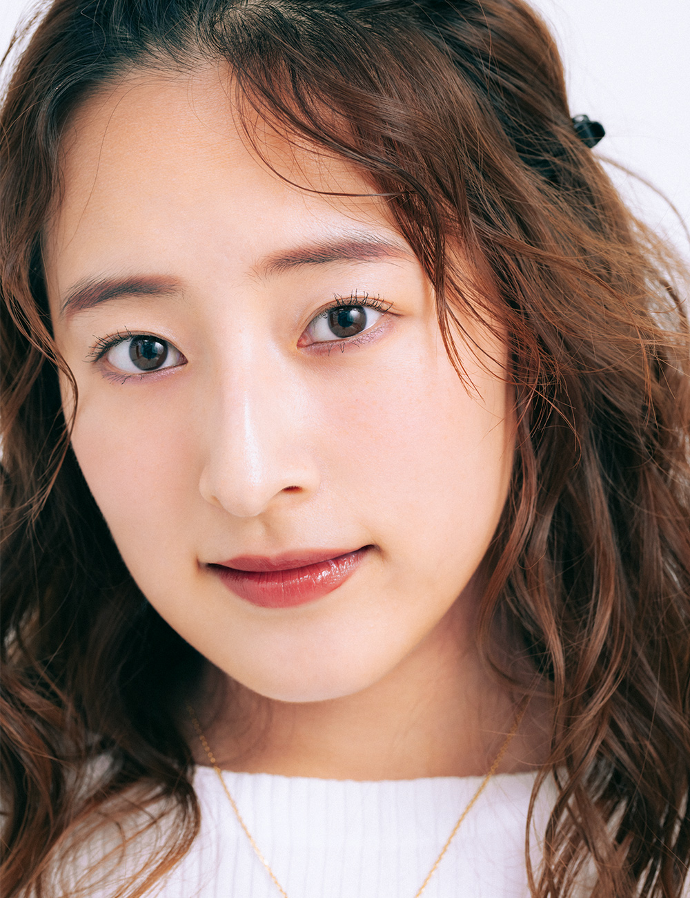 「フェミニン派でも取り入れやすい、華やかなラベンダーピンクをチョイス。上まぶたに淡色、下まぶたに濃色を使い、上下のまぶたでグラデーションに。アイシャドウに合わせて眉にもほんのりパープル感を足し、カラーメークに統一感を出しています」(ヘアメーク・小松さん)