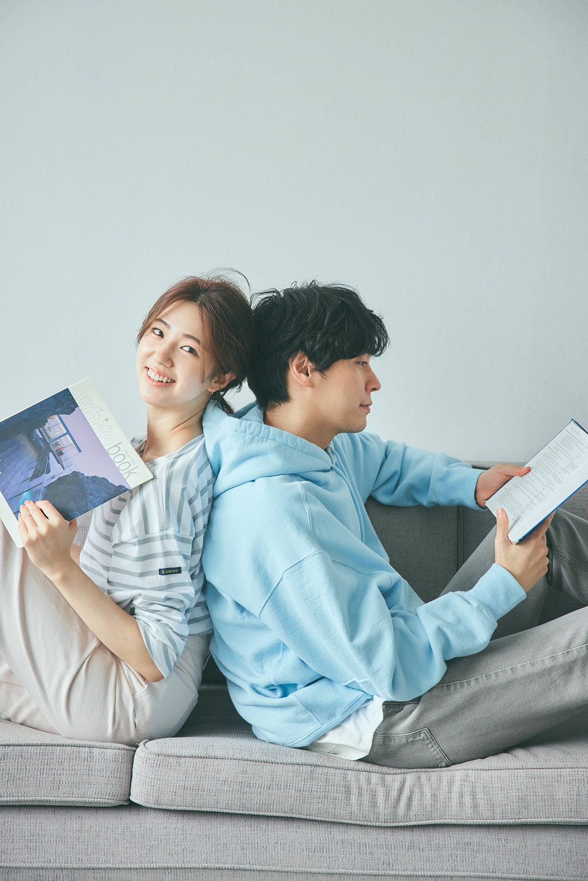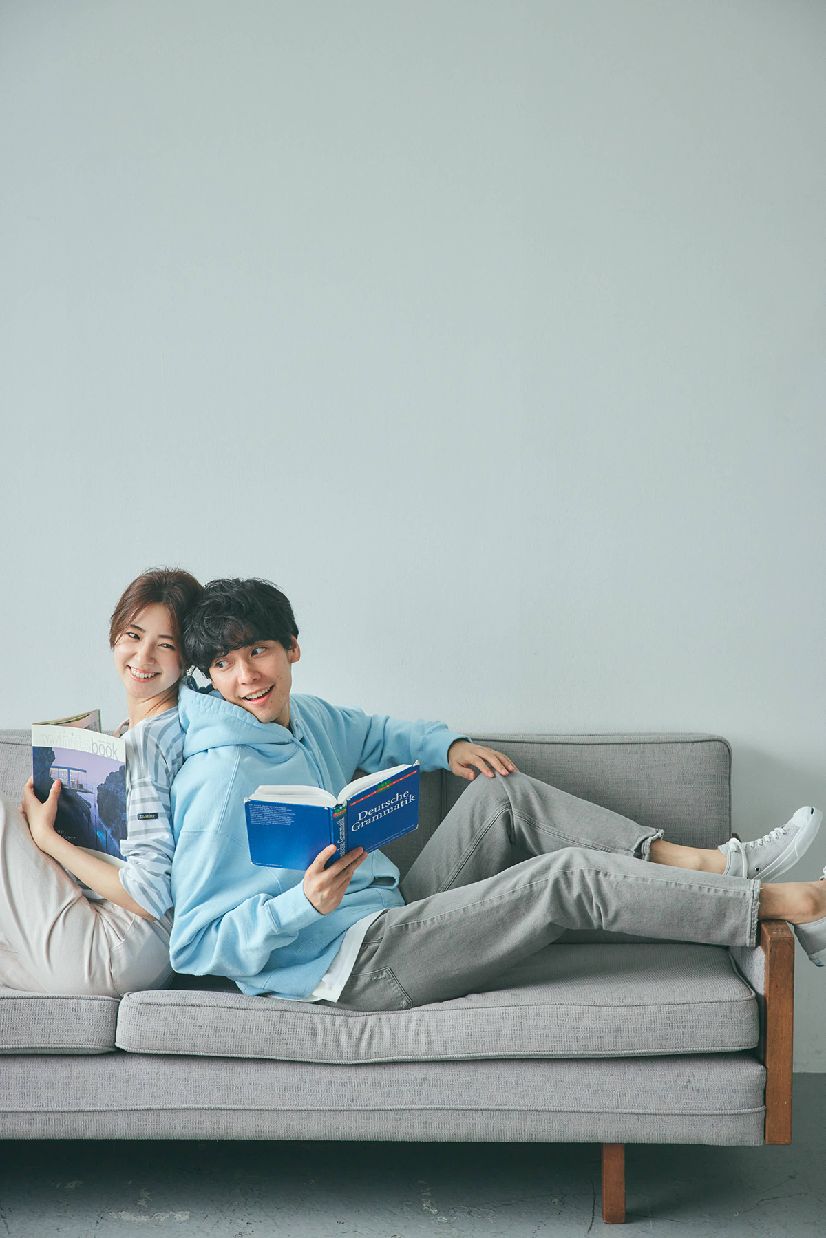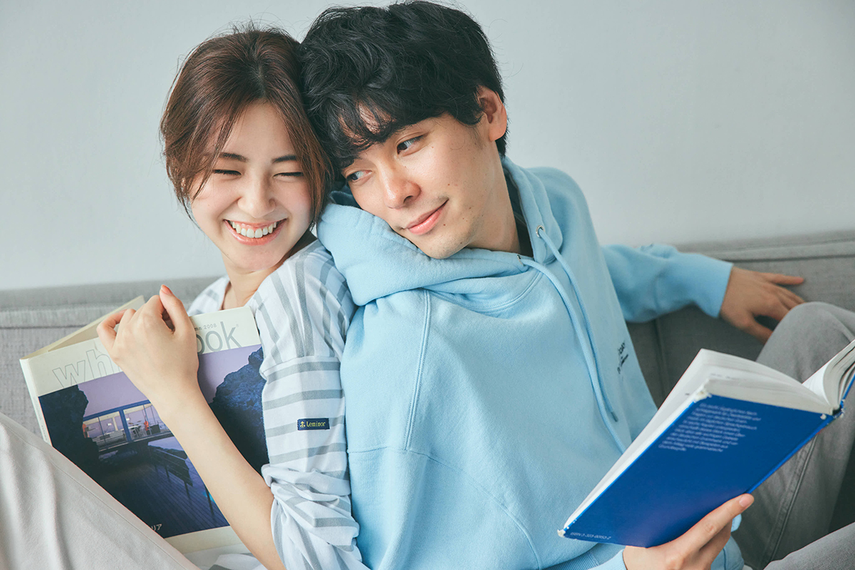 [彼女]ボーダートップス¥13,000〈ルミノア〉パンツ※UNION別注 ¥22,880〈セージ〉(ともにトゥモローランド) ピアス¥50,600(ジジ/ホワイトオフィス)[彼]パーカー¥16,000(Jプレス オリジナル/J.プレス & サンズ 青山) Tシャツ¥22,000(エズミ/リデザイン) デニム¥25,300(アッパーハイツ/ゲストリスト) スニーカー¥6,600(コンバース/コンバースインフォメーションセンター)
