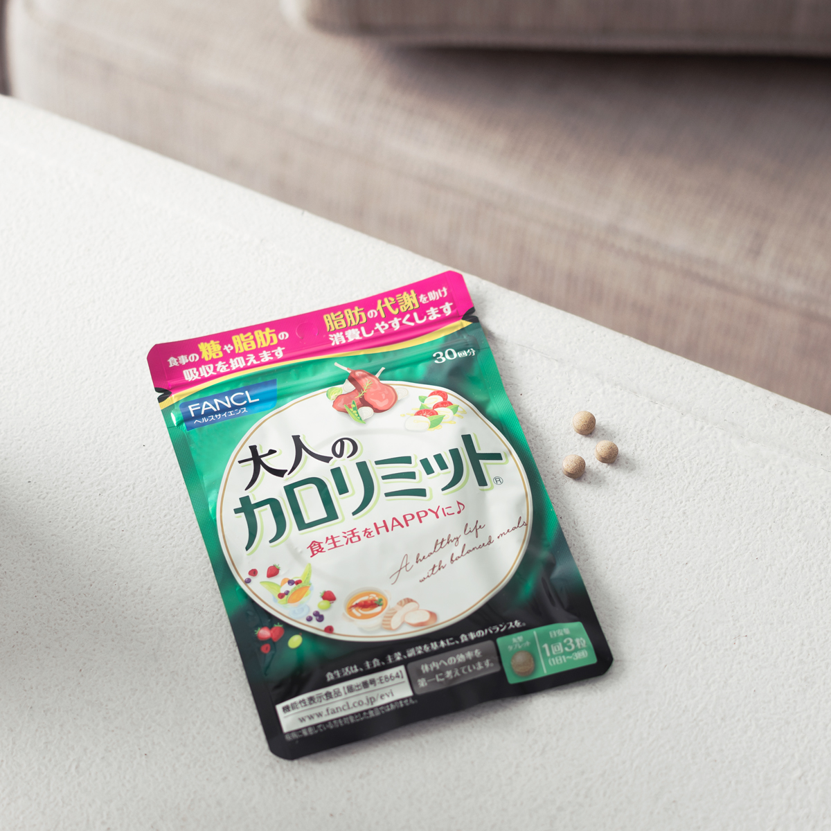 食事の糖や脂肪の吸収を抑える効果のある、3つの成分に加え、脂肪消費成分を配合。1回3粒を続けることでしっかりケア。食事の糖や脂肪だけでなく脂肪の代謝が気になる大人世代におすすめです。大人のカロリミット®90粒入り¥2,800(ファンケル)