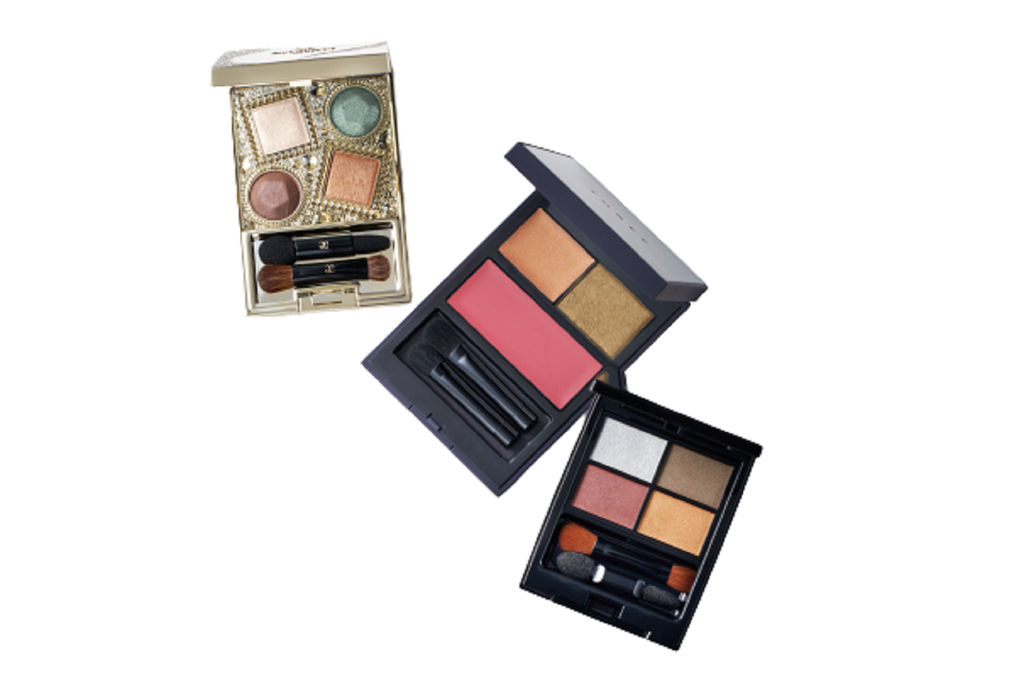 <左から>質感と感触の異なる2種類のベースを2色ずつ入っています。エレガンス ヌーヴェル アイズ 32¥6,050(エレガンス コスメティックス)2種のアイシャドウとチークがセットに。THREE スターダストドリーマームードパレットX02¥7,150<限定発売>(THREE)締め色のカーキブラウンと秋色3色が入ったパレット。ミネラルクラッシィシャドー メープルガーランド¥4,400<限定発売>(エトヴォス)