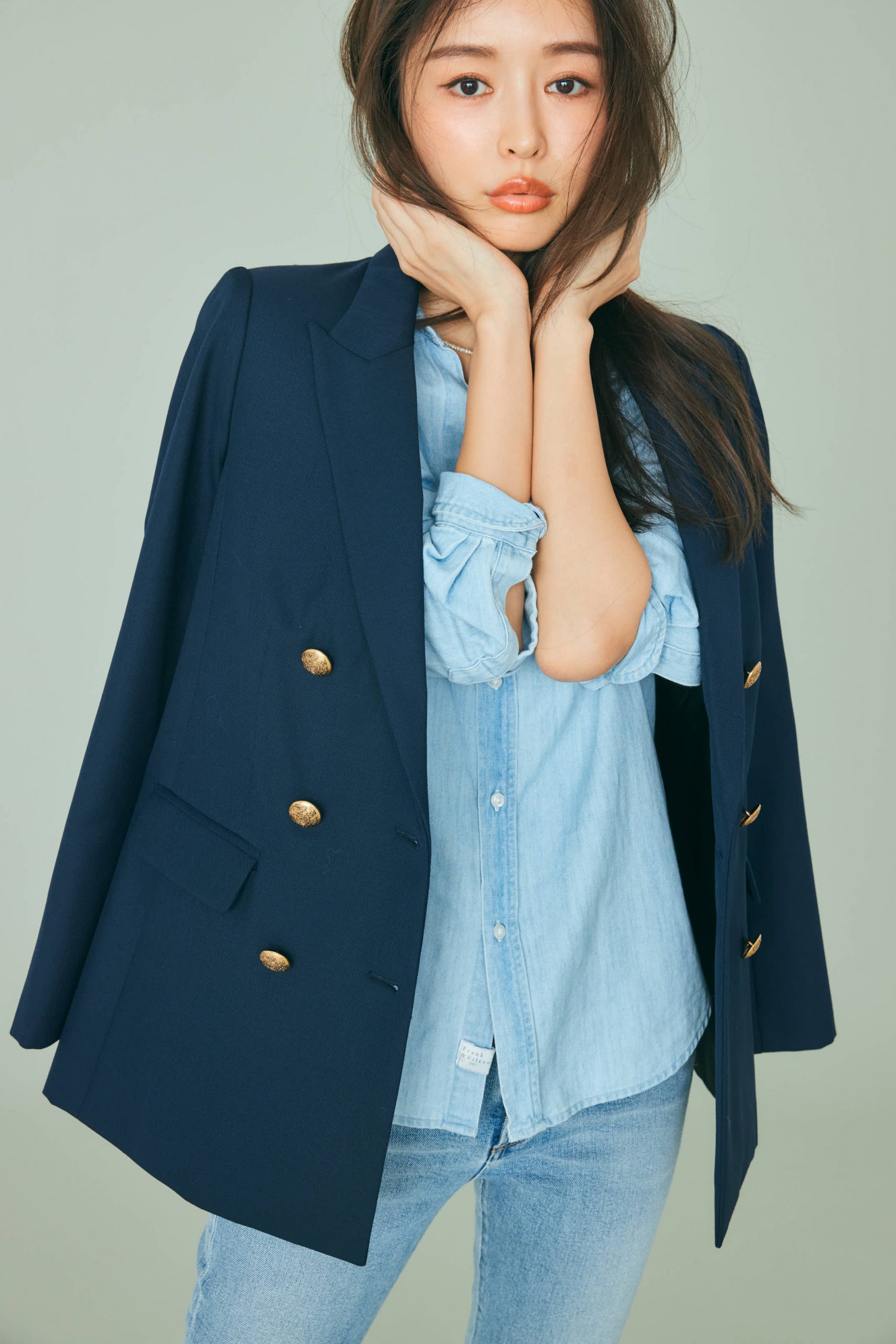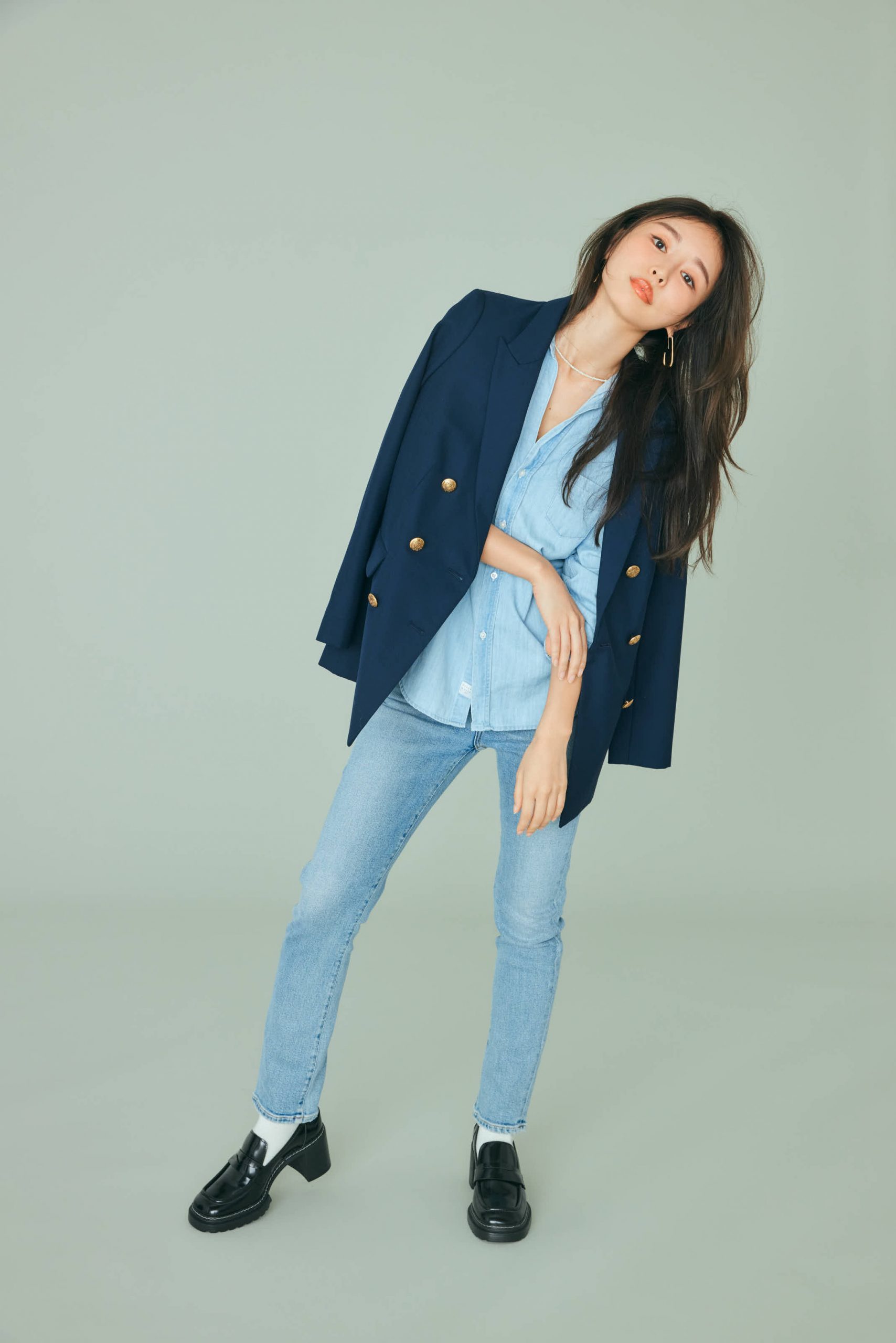 ジャケット¥22,400(バナナ・リパブリック)デニムシャツ¥34,100(フランク&アイリーン/サザビーリーグ)デニムパンツ¥26,400(AGOLDE/シチズンズ・オブ・ヒューマニティ)ローファー¥7,200(CHARLES & KEITH/CHARLES & KEITH JAPAN)ピアス¥14,630<ソコ>ネックレス¥11,220<メルセデス サラザール>(ともにZUTTOHOLIC)ソックス¥1,320(タビオ/Tabio)
