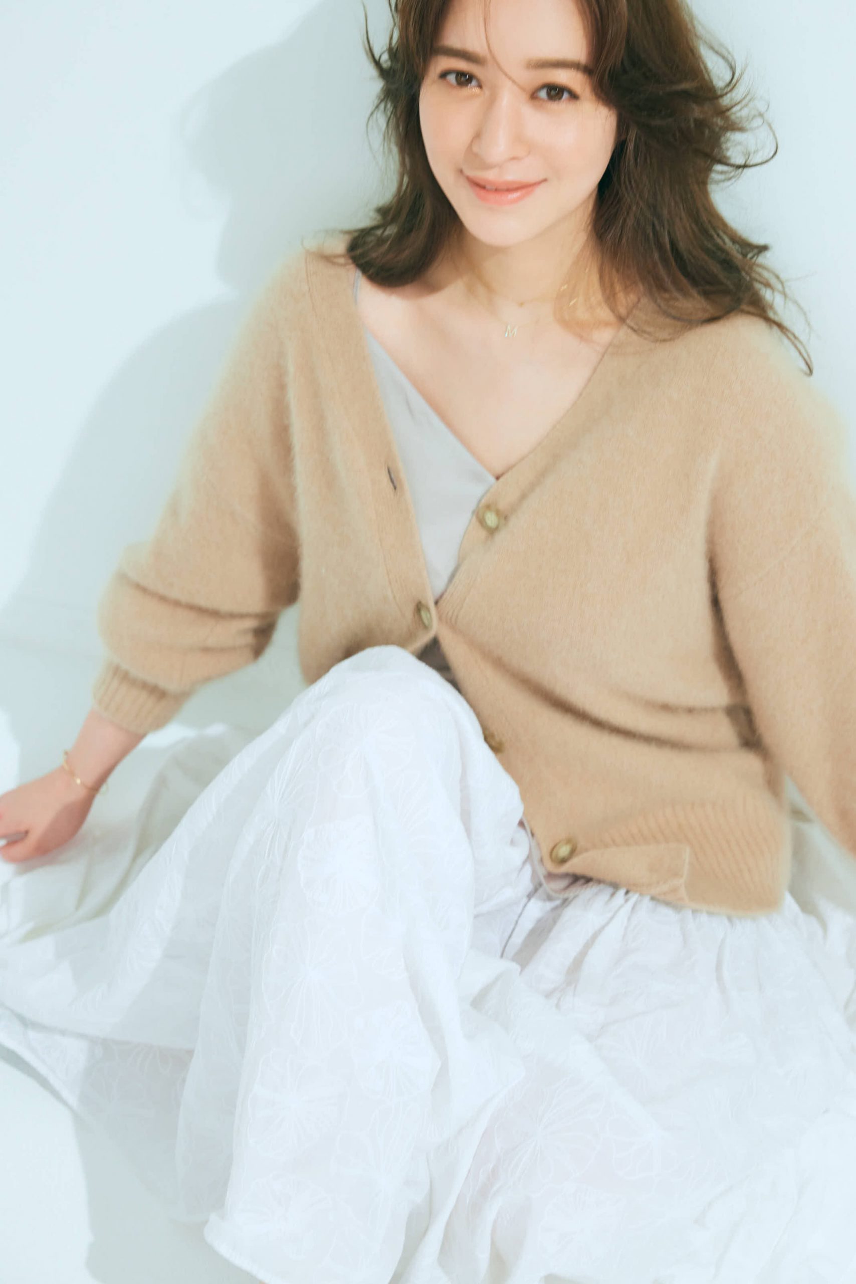 カーディガン※EC限定¥27,500キャミソール¥14,300(ともにウィム ガゼット/ウィム ガゼット ルミネ新宿店)スカート¥52,800(マーレット/サザビーリーグ)ハートネックレス¥37,400イニシャルネックレス¥74,800右手人差し指一粒ダイヤリング¥44,000ハートリング¥34,100中指パールリング¥40,700右手フックバングル¥132,000〜左手コードブレス¥24,200(すべてBijouterie euro flat)