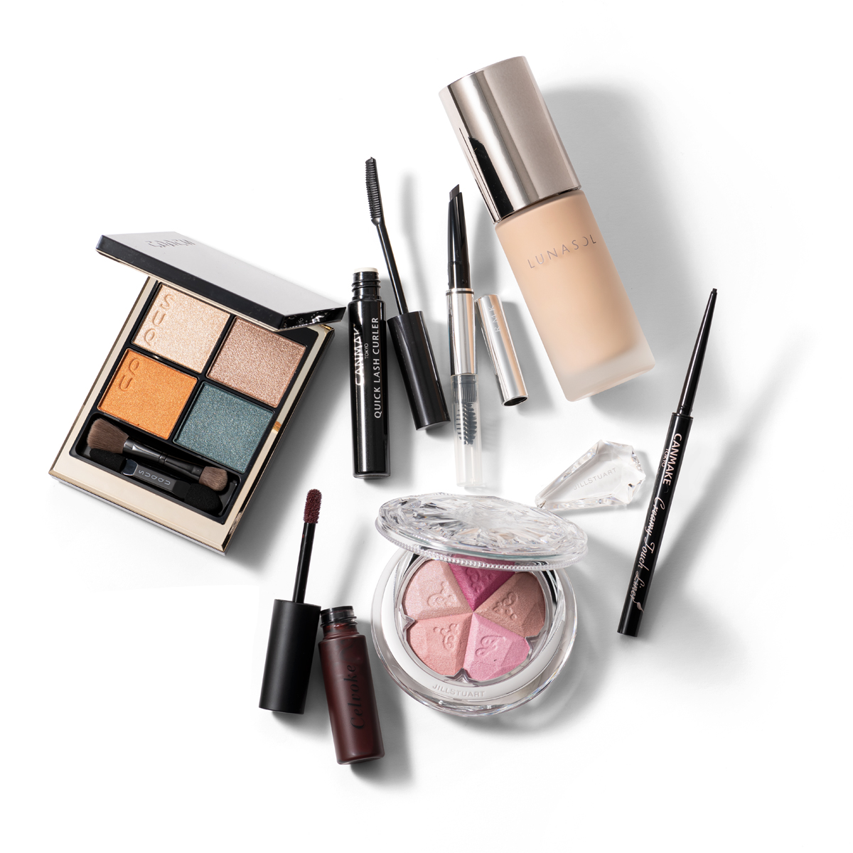 [右上から時計回りに]たっぷりの潤いを抱えたリキッドが、薄膜で肌に溶け込み、みずみずしいツヤ肌を演出。ルナソル ライトスプレッドクリーミィリクイド SPF28・PA++ 全6色 ¥6,050(カネボウ化粧品) 涙や汗、擦れにも強いウォータープルーフ。ディープブラックが目のフレームをくっきり強調。キャンメイク クリーミータッチライナー 01 ¥715(井田ラボラトリーズ) 華やかな仕上がりを叶える5色で、頬の血色も立体感も思いのまま。ブルーム ミックスブラッシュ コンパクト 12 ¥4,620(ジルスチュアート ビューティ) 植物由来のオイルをたっぷりと配合し、濃密な発色でふっくらとした艶リップに。エンスロール グロス 02 ¥3,080(セルヴォーク) フレッシュなオレンジとメイクの鮮度がアップするブルーグリーンがアクセント。シグニチャー カラー アイズ 08 ¥7,700[2022年1月7日限定発売](SUQQU) 重ねてもにじまず、まつ毛の一本一本を軽やかにコーティング。今回はアイブロウマスカラとして使用。キャンメイク クイックラッシュカーラー BK ¥748(井田ラボラトリーズ) 芯先が斜めにカットされたなぎなたタイプ。落ち着いたグレーで引き締まった印象に。RMK アイブロウペンシルM 01 ¥2,200(RMK Division)