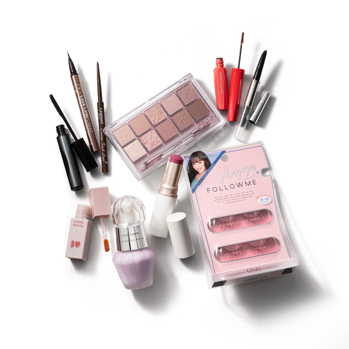 [右上から時計回りに]なぎなた型でふんわりぼかした眉が簡単に。明るめのブラウンでソフトな印象に。RMK アイブロウペンシルM 03 ¥2,200(RMK Division) 付けまつ毛初心者にもおすすめのふんわりロングタイプ。D-UP フォロミー 02(ヘアメイク私物) 肌に薄くフィットして、デューイな輝きをプラスするスティック状のハイライター。フレッシュな血色をもたらすベリー色。hince トゥルーディメンションラディアンスバーム レアスリップ ¥3,300(hinceカスタマーセンター) ラベンダーパールの発光感で、くすみを飛ばして透明感あふれるツヤ肌に。イルミネイティング セラムプライマー 02 30mL ¥3,520(ジルスチュアート ビューティ) ”むっちりふわふわ”のマットな質感で、やわらかに唇を染め上げるティント処方。ビーアイドル むっちリップ 01 ¥1,540 (かならぼ) 美しいカールをまつ毛に記憶。素まつ毛の美しさを引き立てるクリアカラー。ケイト ラッシュフォーマー(クリア)CL-1 ¥1,078[編集部調べ](カネボウ化粧品) コシのある筆と、絶妙な筆の液含みの独自設計により、繊細なラインも滑らかに描きやすい。。ラブ・ライナー リキッドアイライナーR3 ダークブラウン ¥1,760(msh) 繊細なラインも描きやすい極細ジェルペンシル。優しげな目元を引き立てるミディアムブラウン。キャンメイク クリーミータッチライナー 02 ¥715(井田ラボラトリーズ) どんな肌色にも馴染むモーヴ系のカラーをセット。まぶたにフィットする大粒のグリッターも使いやすい。プロアイパレット 13 ¥3,840(クリオ) 眉毛がパリッと固まることなく、ダマのない自然な仕上がりが長時間続く。デジャヴュ アイブロウカラー ウォームブラウン ¥880(イミュ)