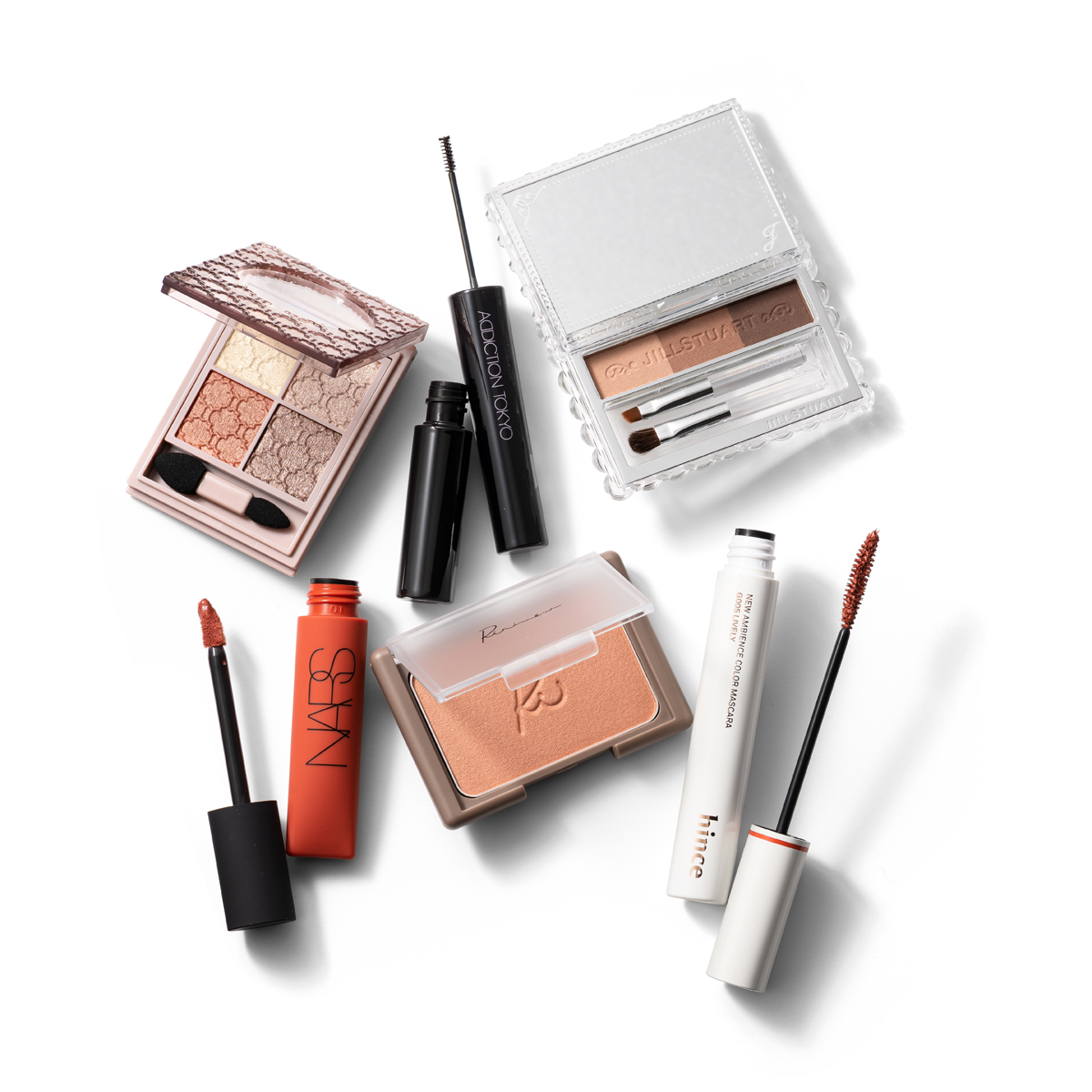 [右上から時計回りに]ピンクニュアンスのカラーでふんわりフェミニンな眉を演出。2つ折りのブラシも使いやすい。ジルスチュアート ニュアンスブロウパレット01 ¥3,520(ジルスチュアート ビューティ) 大人の目元に馴染むヴィンテージカラーで洗練された雰囲気に。hince ニューアンビエンスカラーマスカラ G005 ¥2,200(hinceカスタマーセンター) クリームとパウダーの中間のような質感が肌に溶け込むように馴染んで、透けるようなツヤと血色を演出。リリミュウ ヴェールグロウチーク 05 ¥1,980(コージー本舗) 何もつけていないようなエアリーなテクスチャーが唇を彩りソフトフォーカスされたような優しい仕上がりに。NARS エアーマット リップカラー 02690 ¥3,850(NARS JAPAN) 上質なツヤときらめき、クリアな発色で、印象的な潤み目に。ヴィセ リシェ グロッシーリッチ アイズ N OR-2 ¥1,320[編集部調べ](コーセー) 極細のマスカラブラシがうぶ毛までキャッチして、自眉のような自然な仕上がりに。アディクション アイブロウマスカラ マイクロ 004 ¥3,080(アディクション ビューティ)