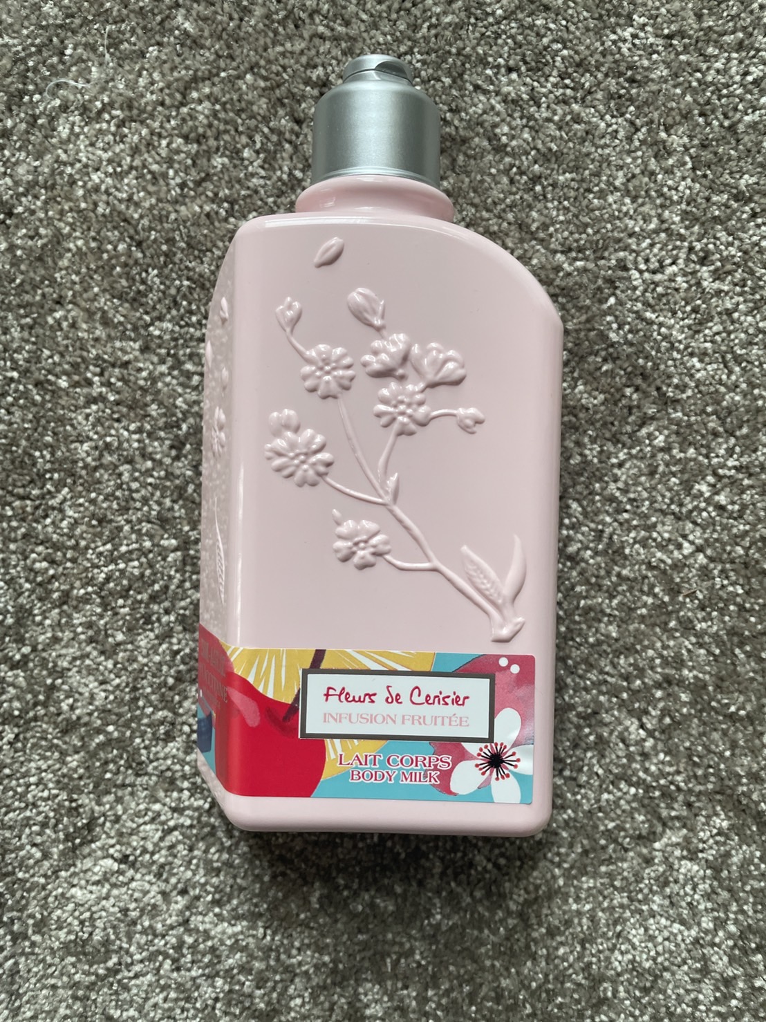 「ボディチェックは昔からの習慣。毎日たくさん歩くので、ふくらはぎがパンパンになるんです。なのでボディミルクを塗りつつ、脚もほぐすようにしています。ロクシタンの『チェリーブロッサム シマーリングボディミルク』を愛用中。自分の力ではどうにもならないくらい疲れたときは、エステサロン『salon de reve』で筋膜リリースとセルライト除去のために「スリムムーブ」もお願いしています」