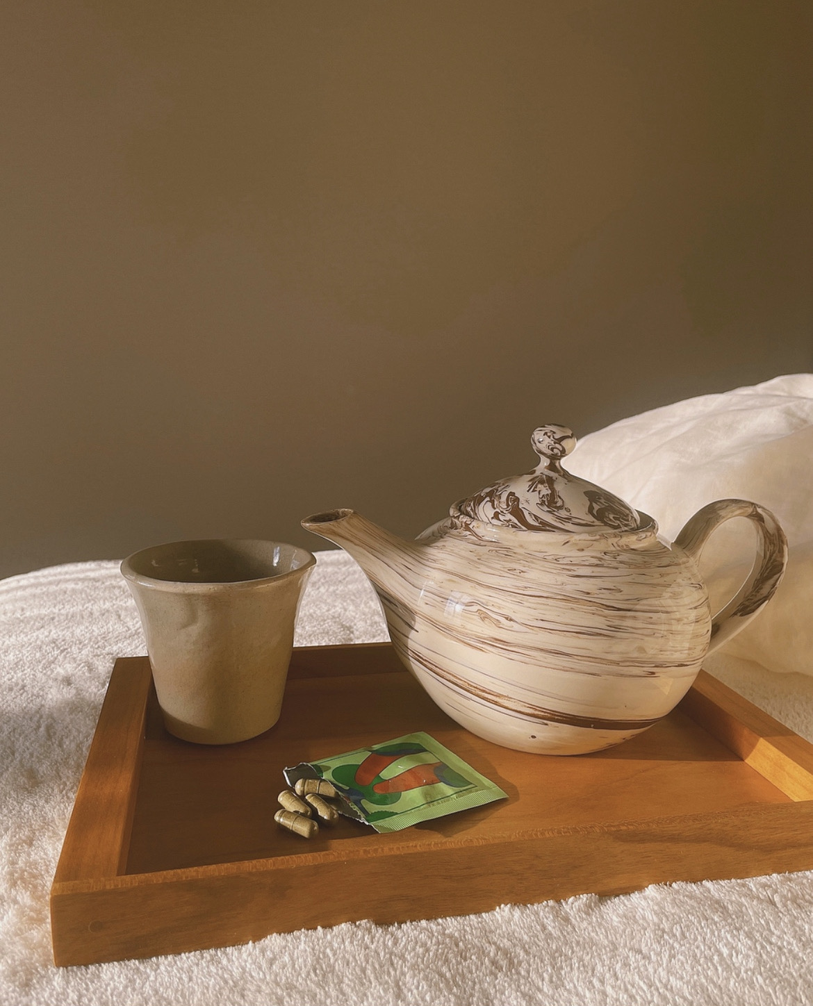 「漢方は生理前・生理中のデトックスと身体に足りない栄養素を補うために。私は青山にある漢方ブティックで自分に合った漢方を選んでもらっています。粉末が少し苦手なので、最近は『NEOTAO』というブランドの、飲みやすいカプセルタイプを見つけました」