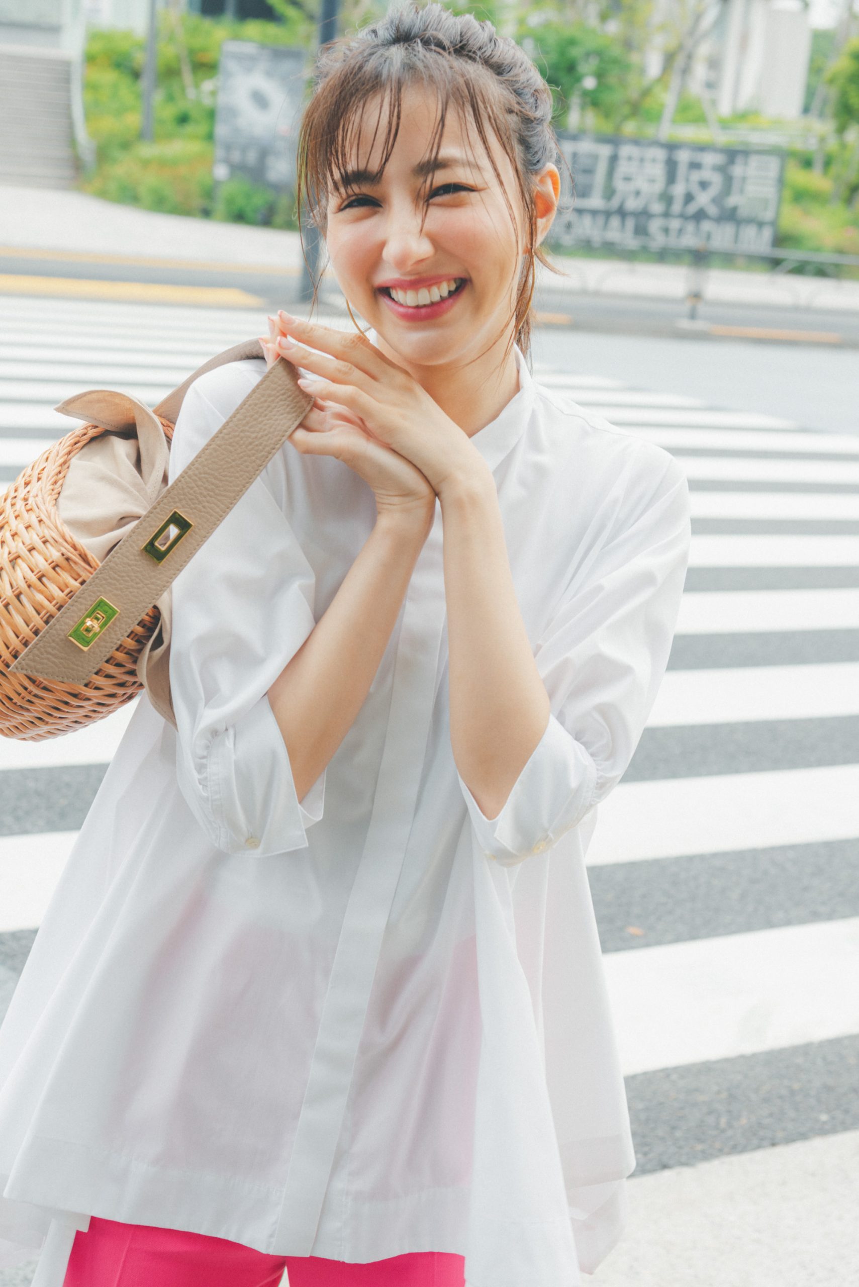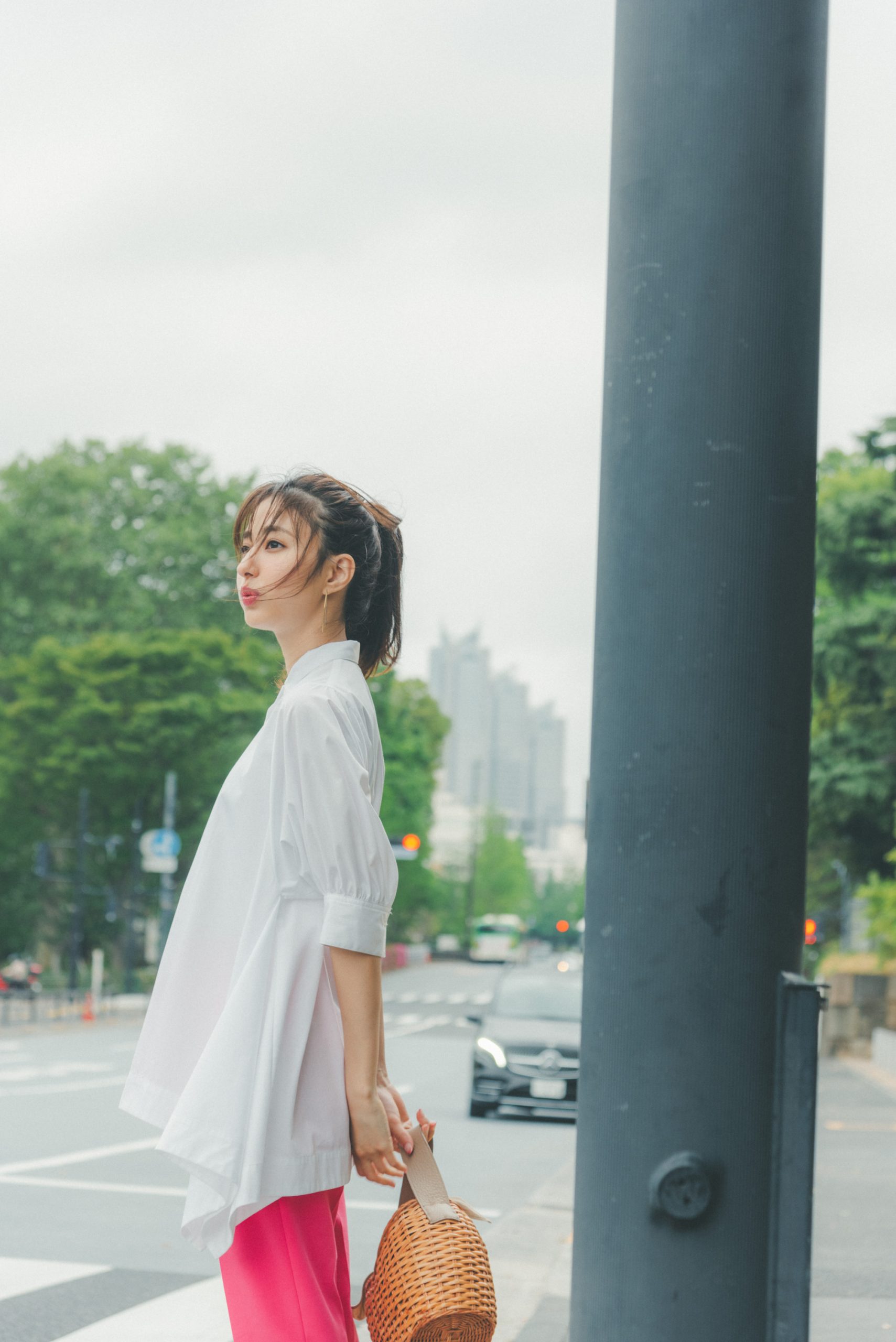ブラウス¥15,950(ハッシュニュアンス/オンワード樫山)パンツ¥26,400(ANAYI)バッグ¥18,700(ヴィオラドーロ/ピーチ)サンダル¥25,300(ツル バイ マリコ オイカワ)ピアス¥9,460(チビ ジュエルズ/チビジュエルズ・ジャパン)