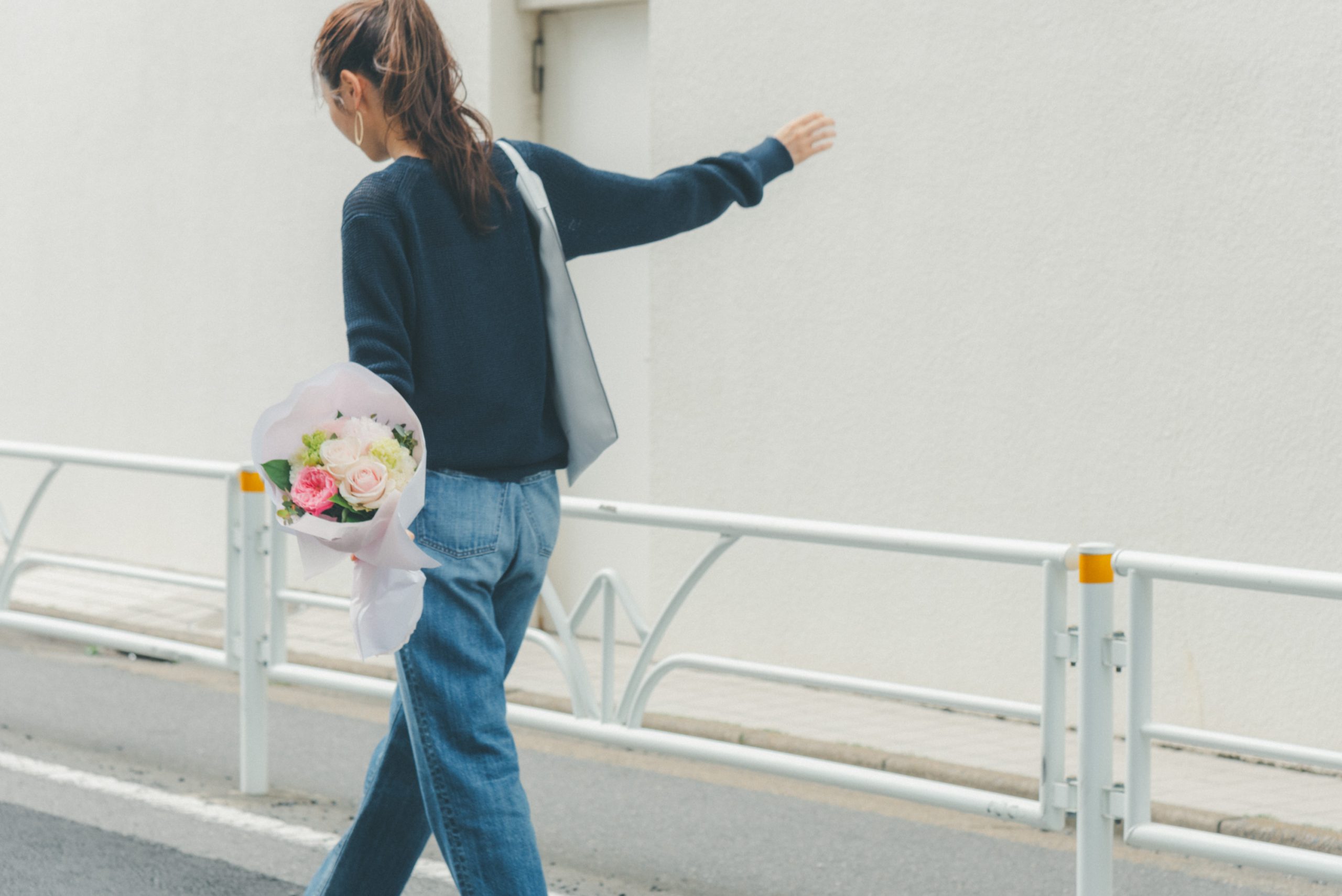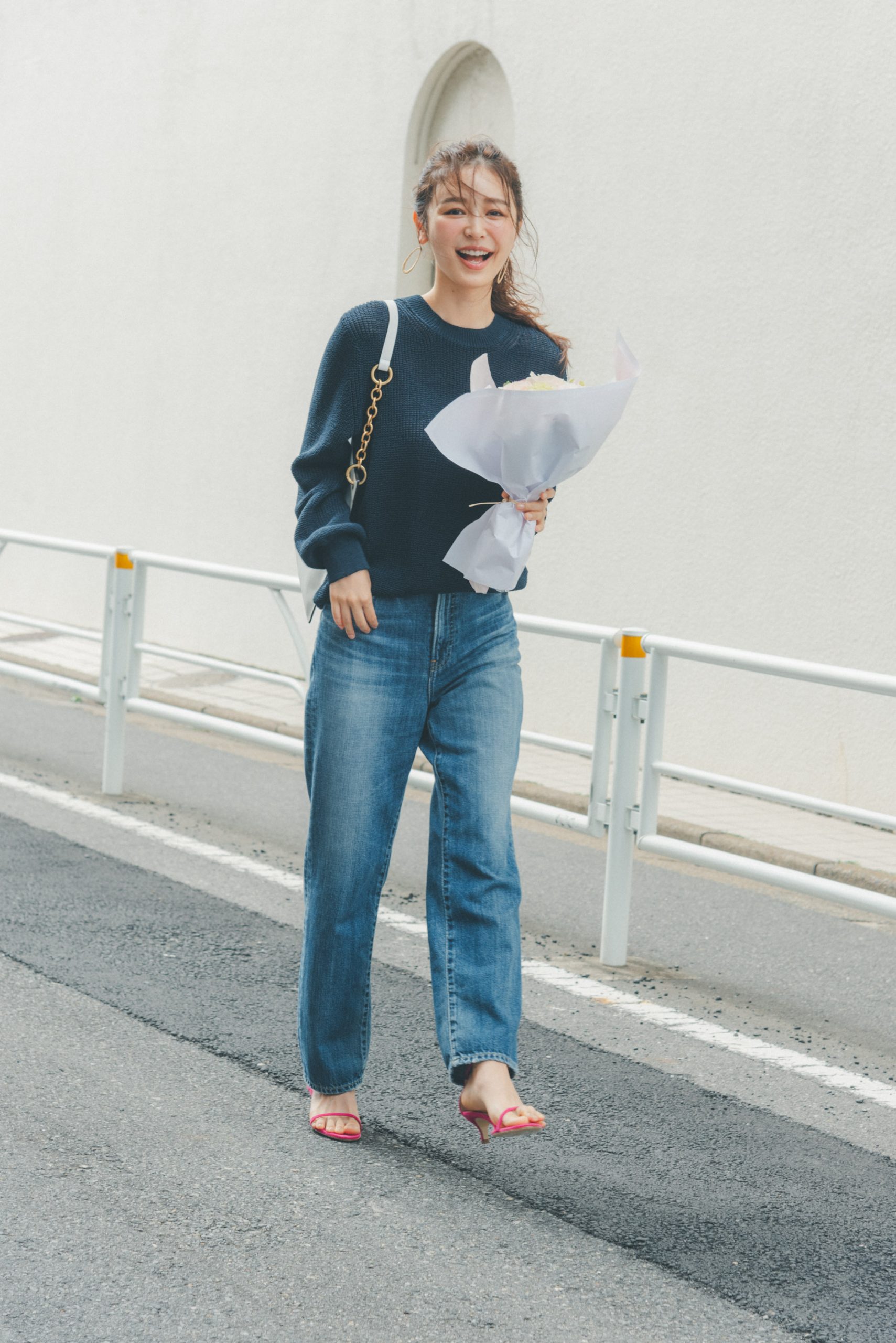 ニット¥24,200(スローン)デニムパンツ¥22,000(レッドカード/ゲストリスト)バッグ¥39,600(オルセット/オルサ)サンダル¥49,500(ネブローニ/アッシュプラスエリオトロープ)ピアス¥2,090(アネモネ/サンポークリエイト)